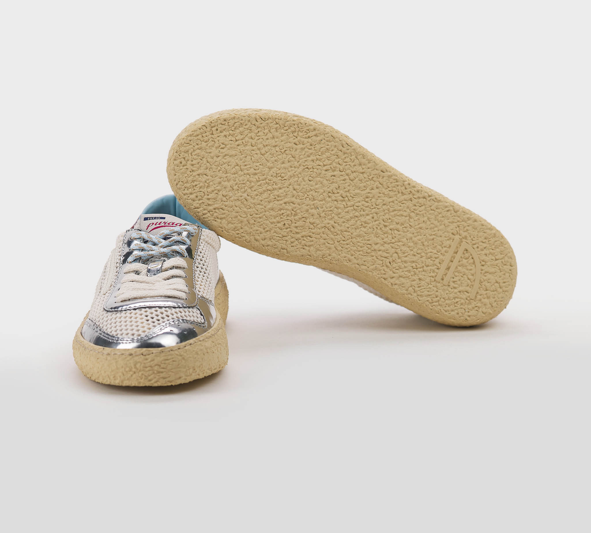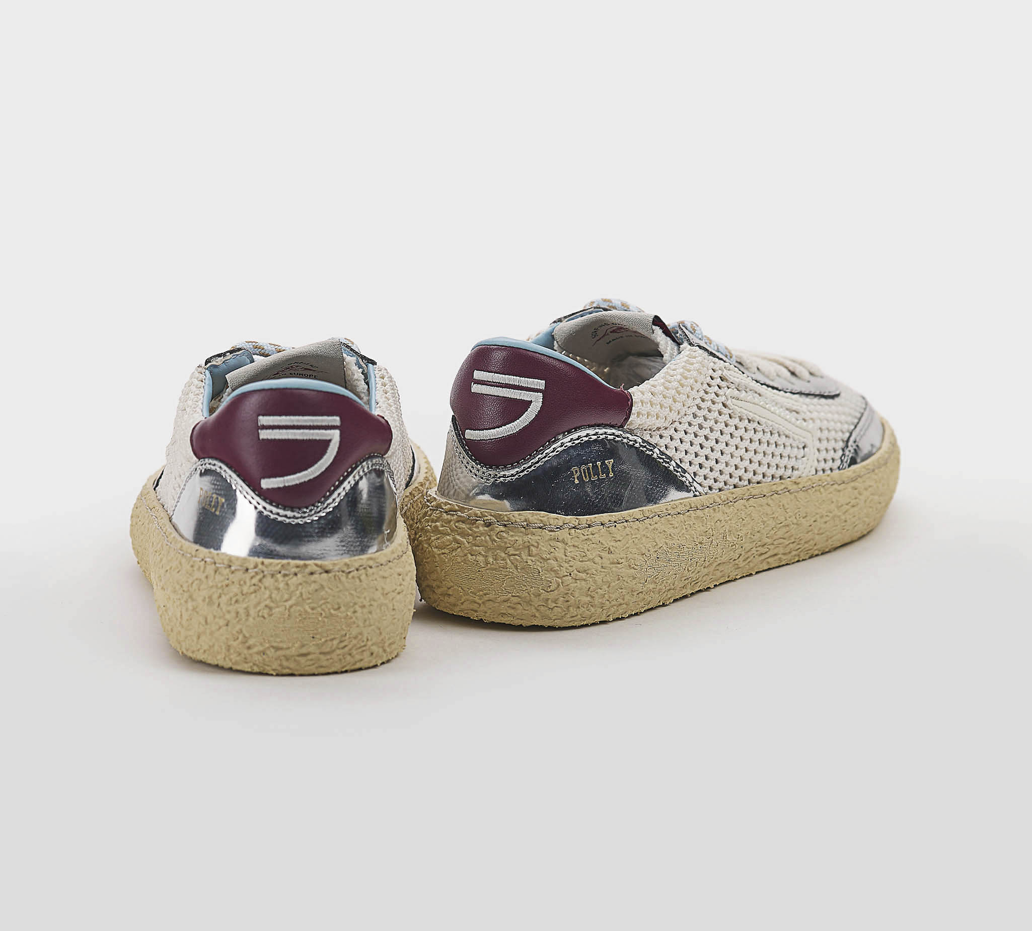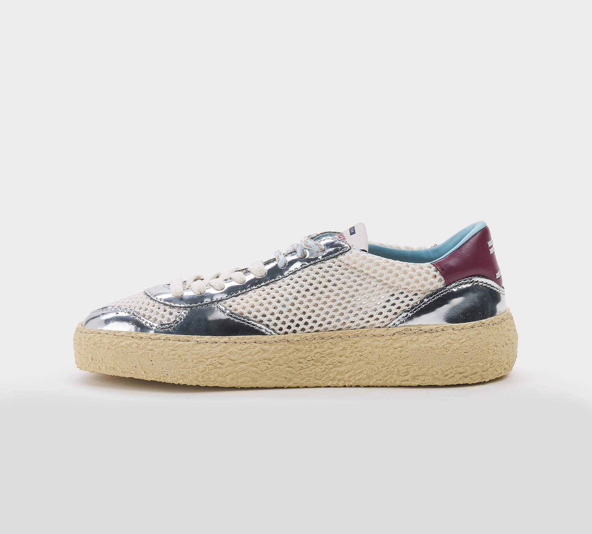 Sneakers in rete panna -inserti pelle argento -logo pelle biano -talloncino pelle bordò -doppio laccio panna-argento -plantare anatomico -calzata regolare Fondo gomma SS 26