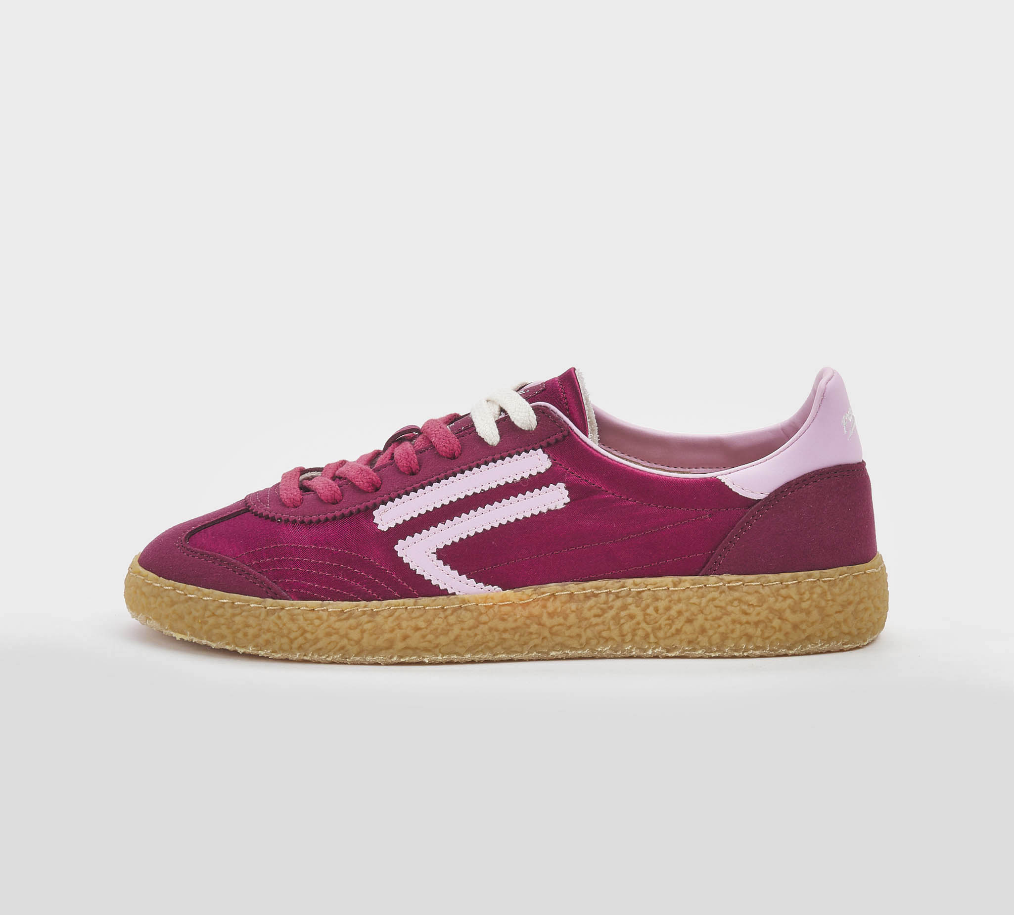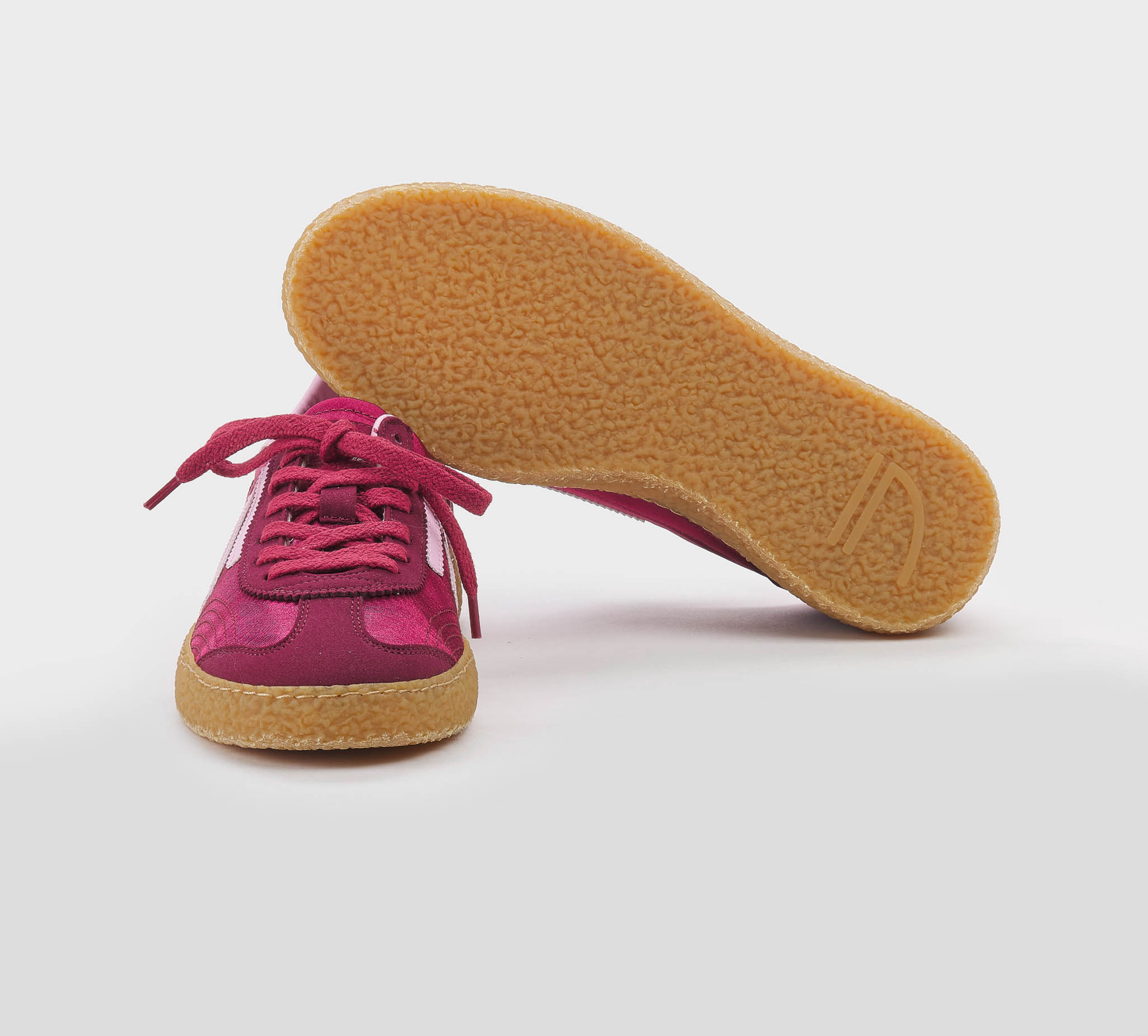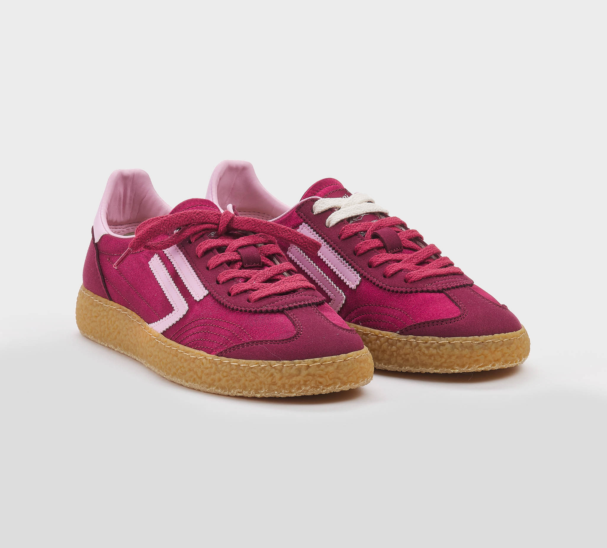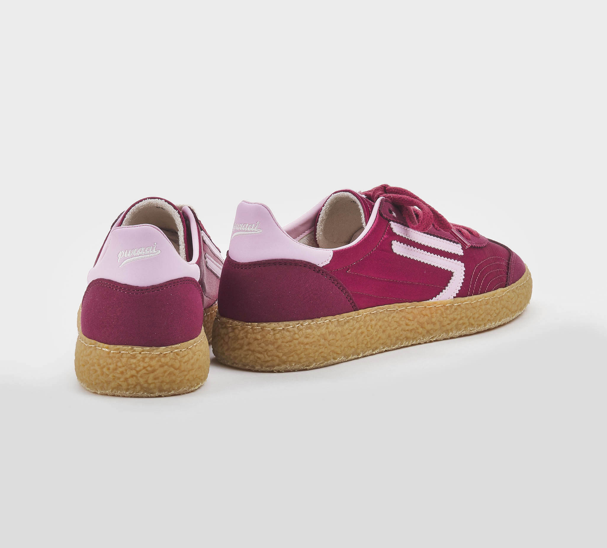 Sneakers in camoscio cilegia -inserti tessuto tecnico rosso -logo e talloncino pelle rosa -doppio laccio rosso-bianco -plantare anatomico -calzata regolare Fondo gomma SS 26