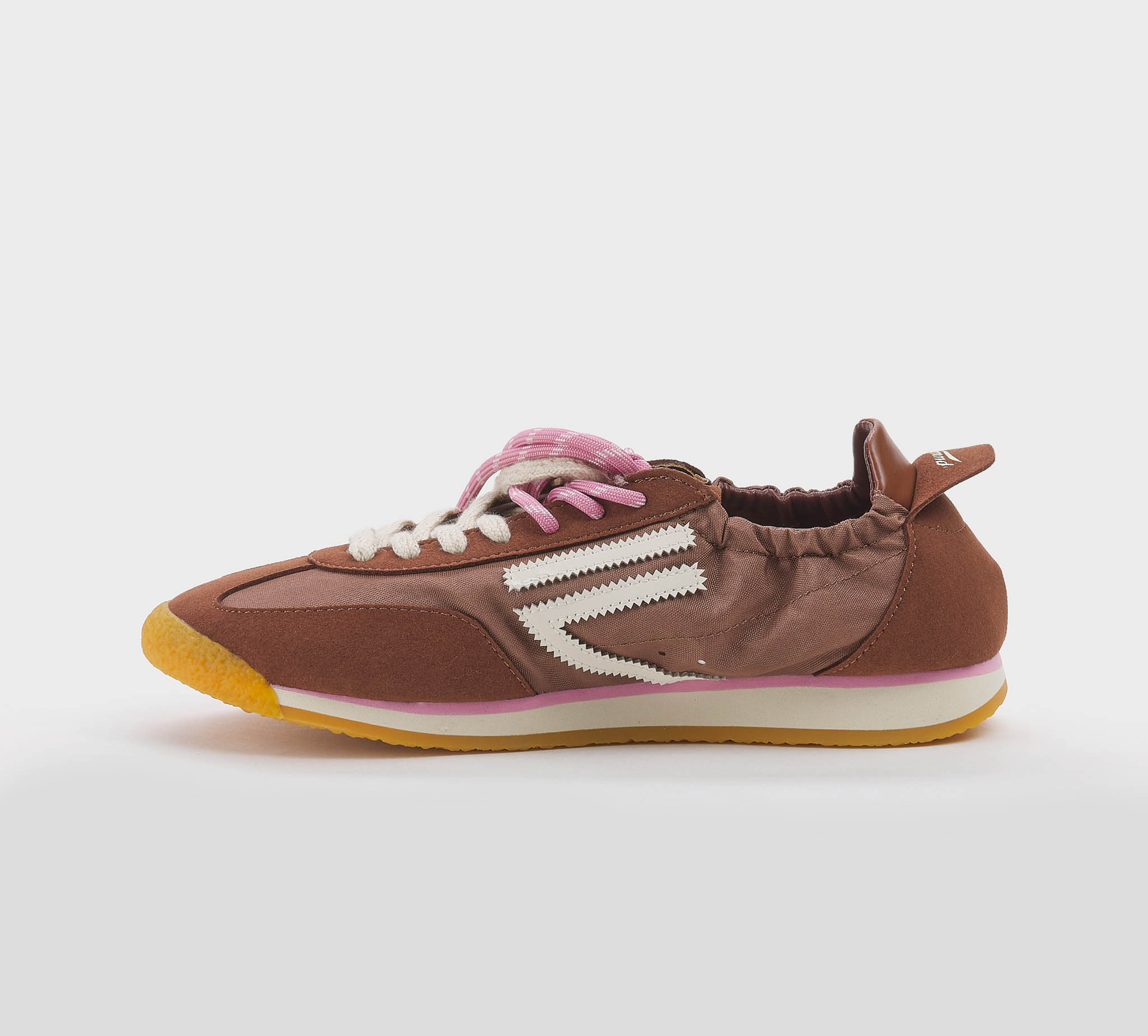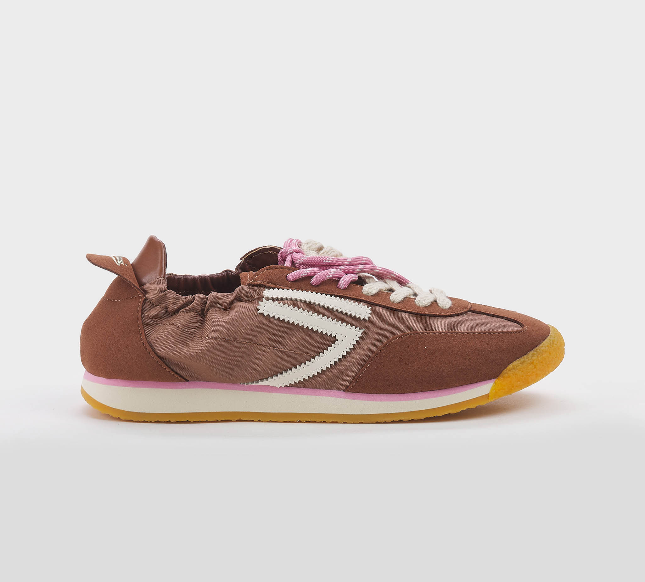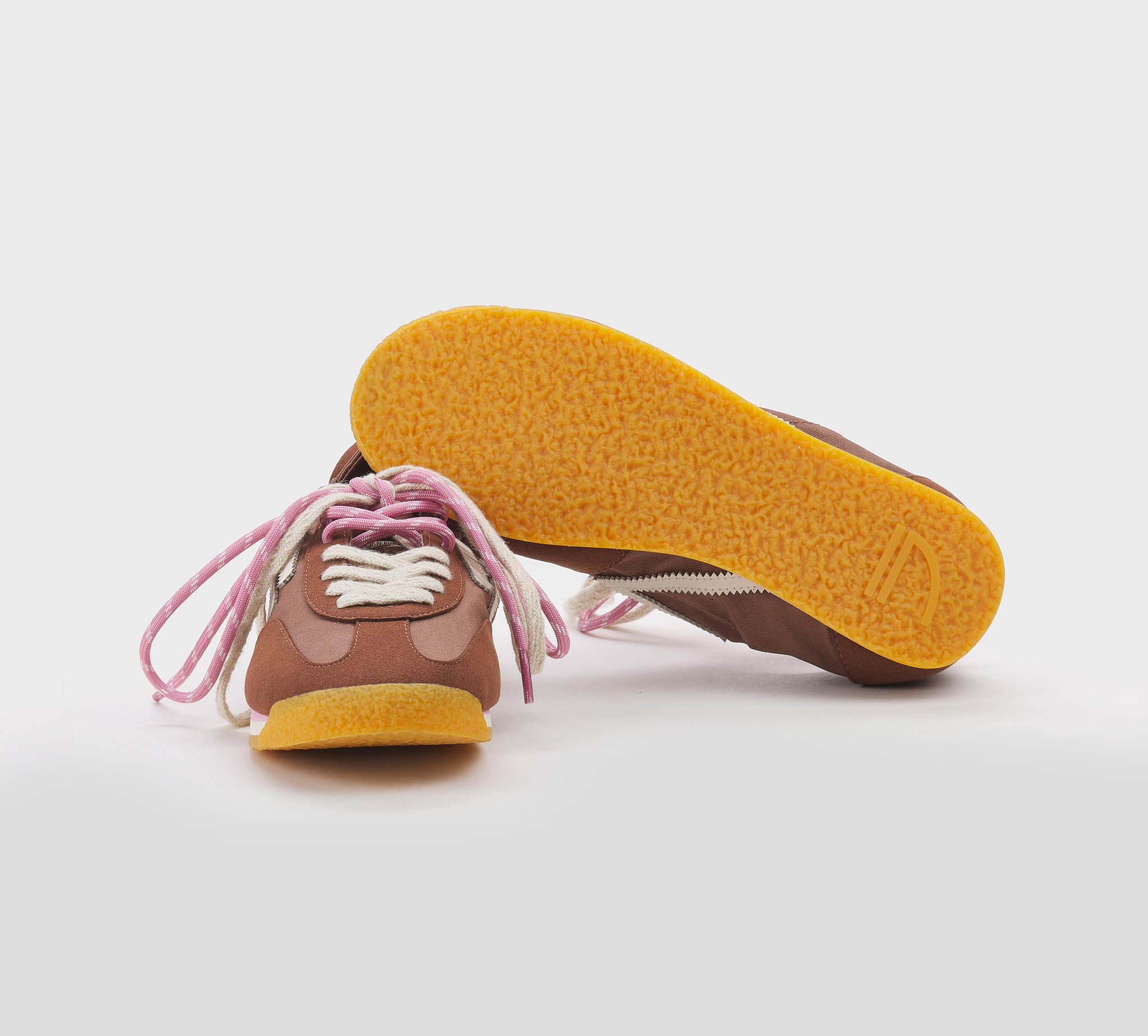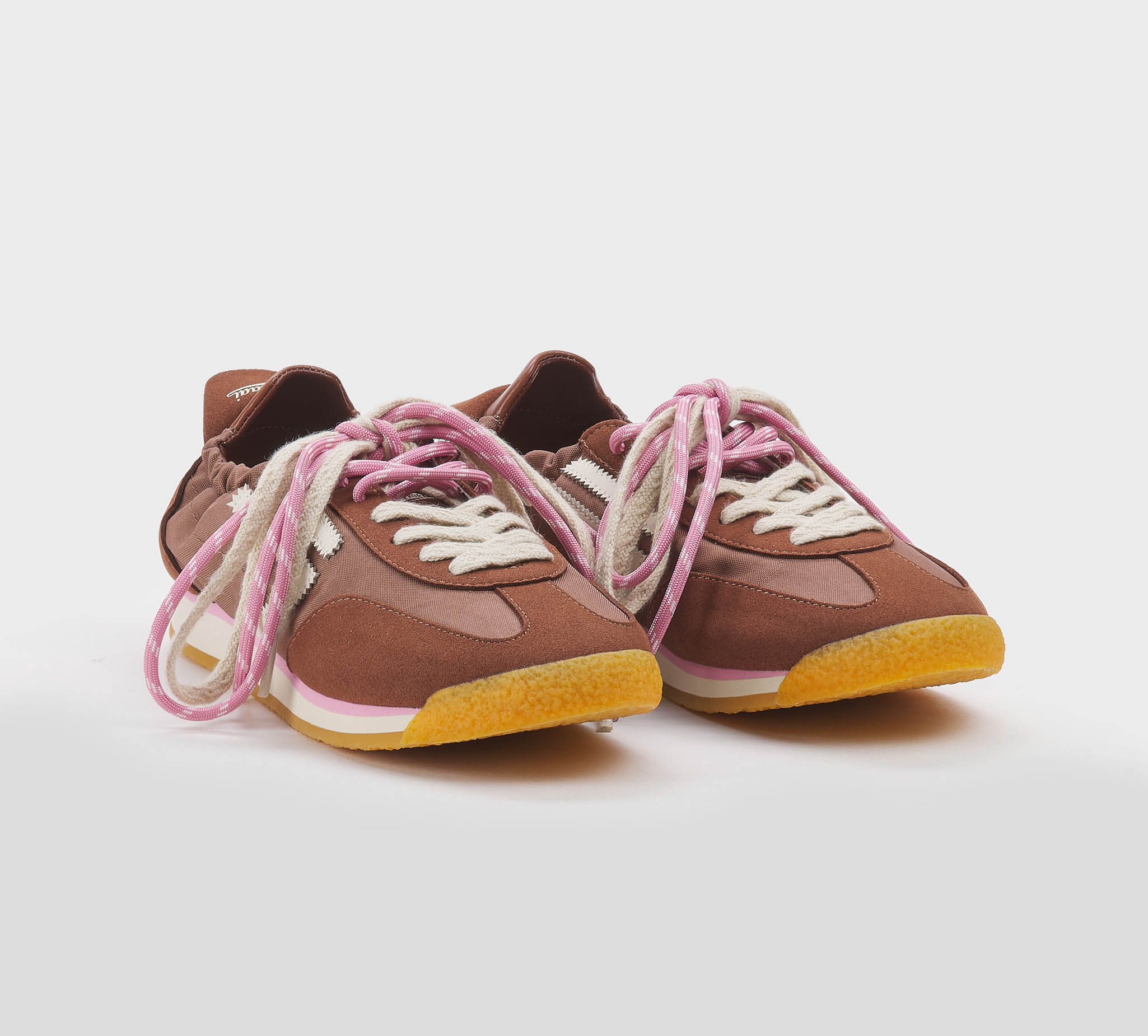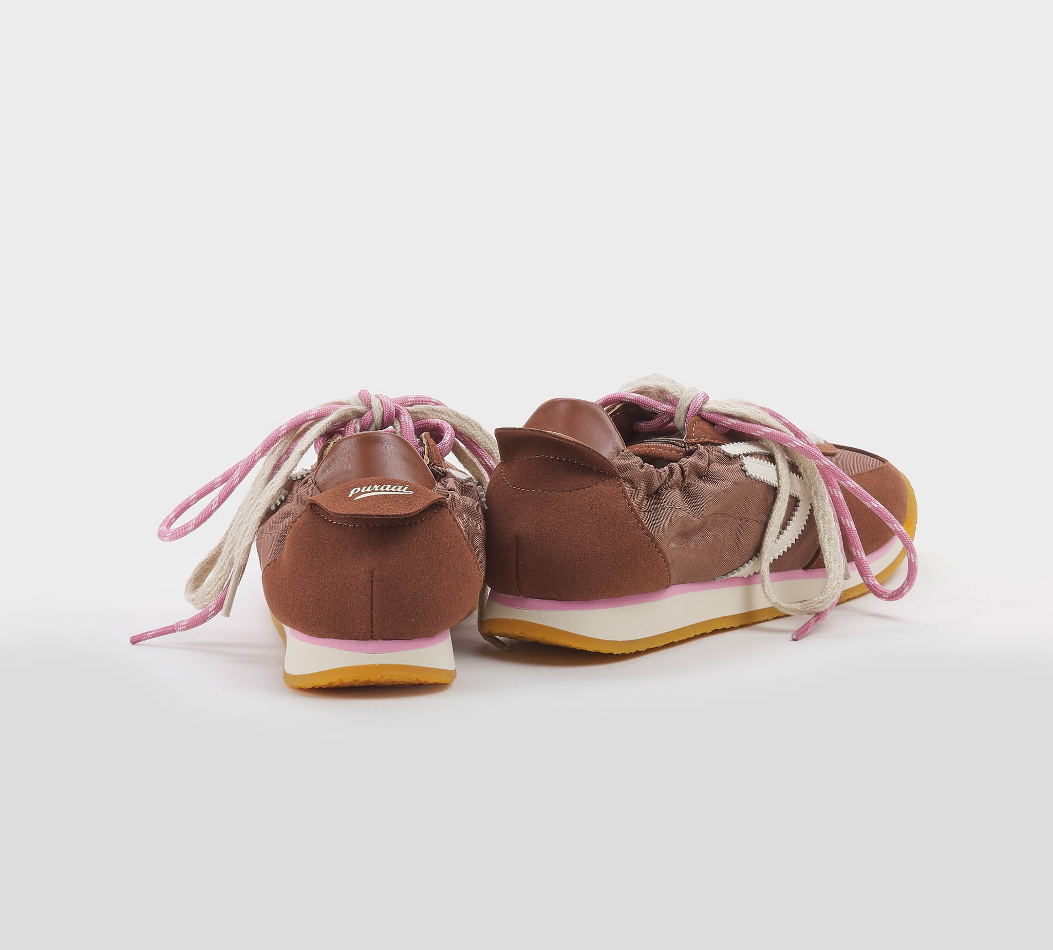 Sneakers arricciata camoscio marrone -inserti tessuto cuoio -logo pelle bianco -talloncino cuoio -doppio laccio bianco rosa -plantare anatomico -calzata regolare Fondo gomma SS 26