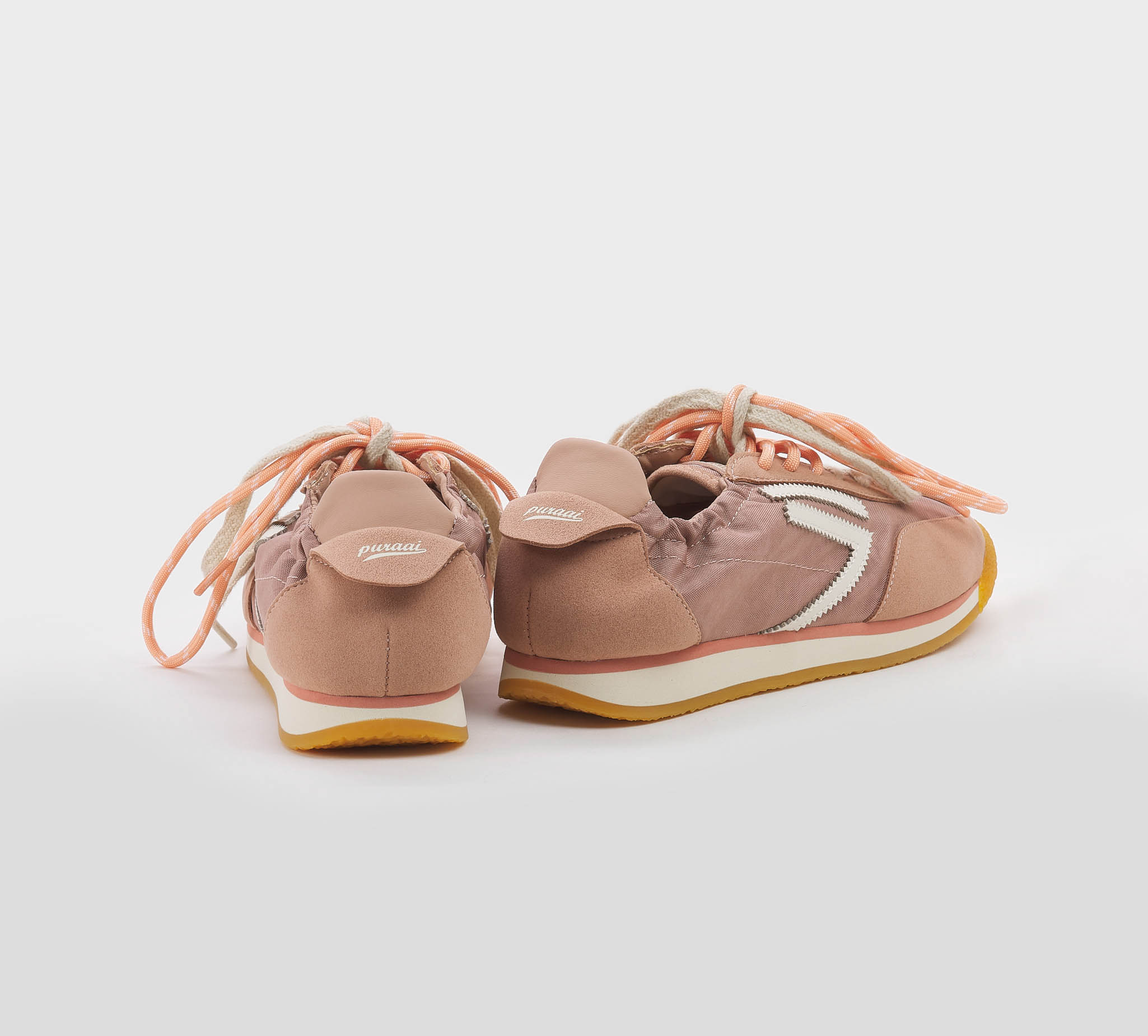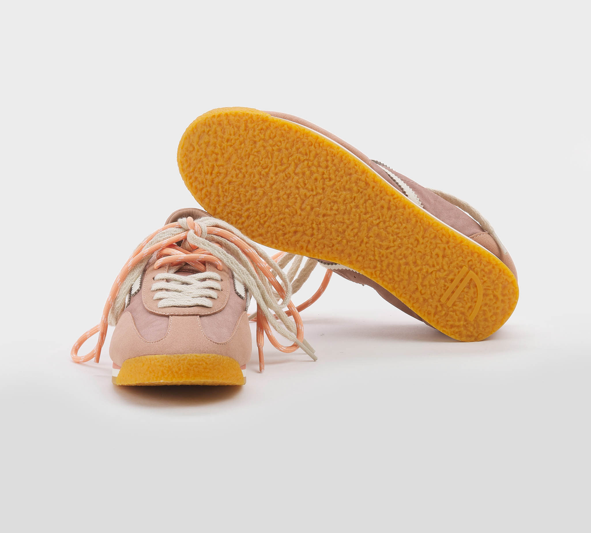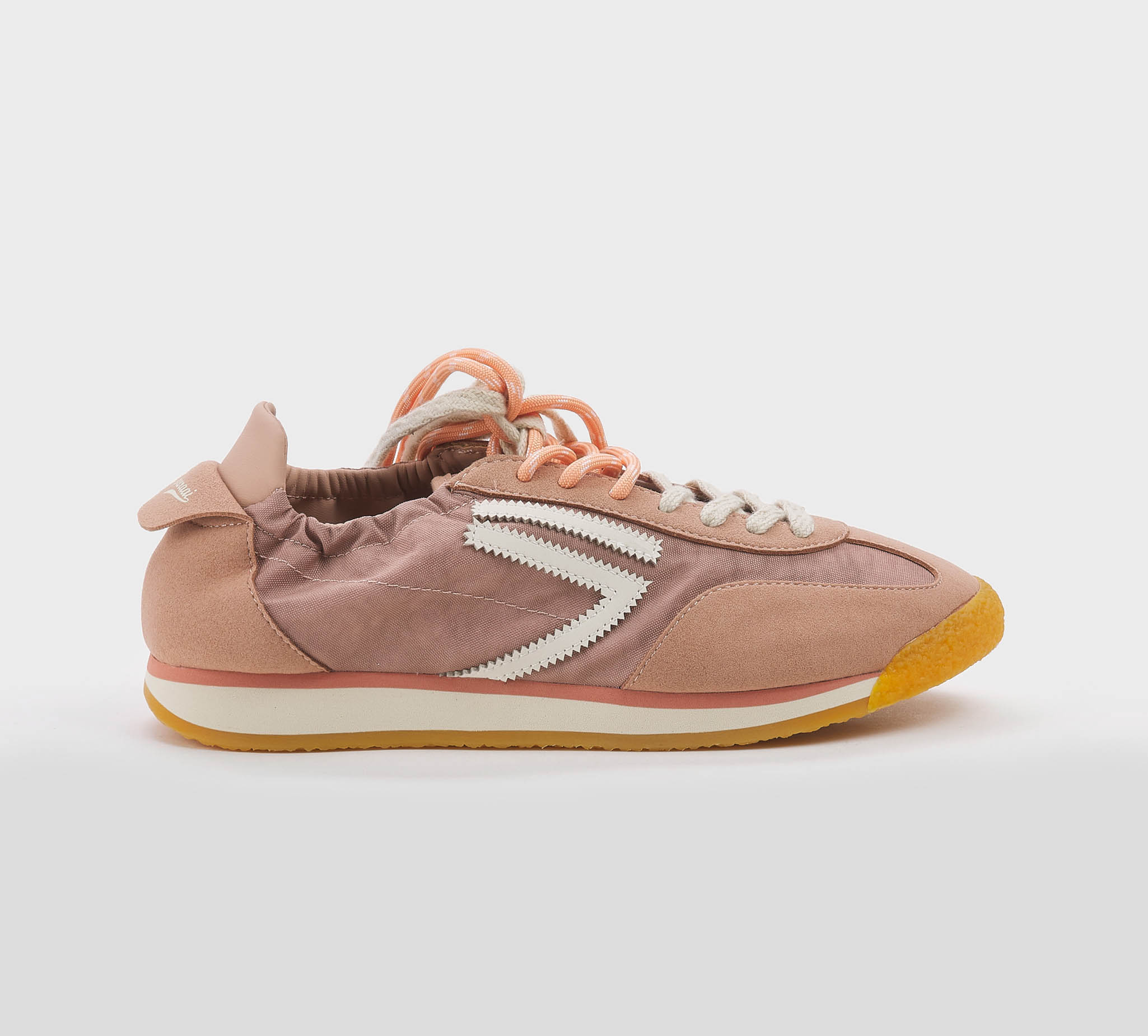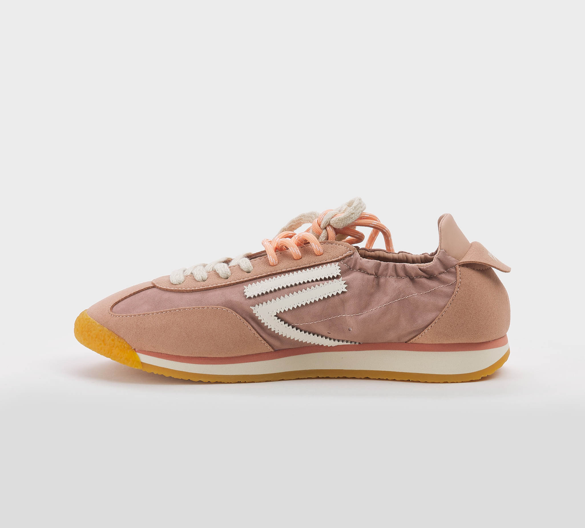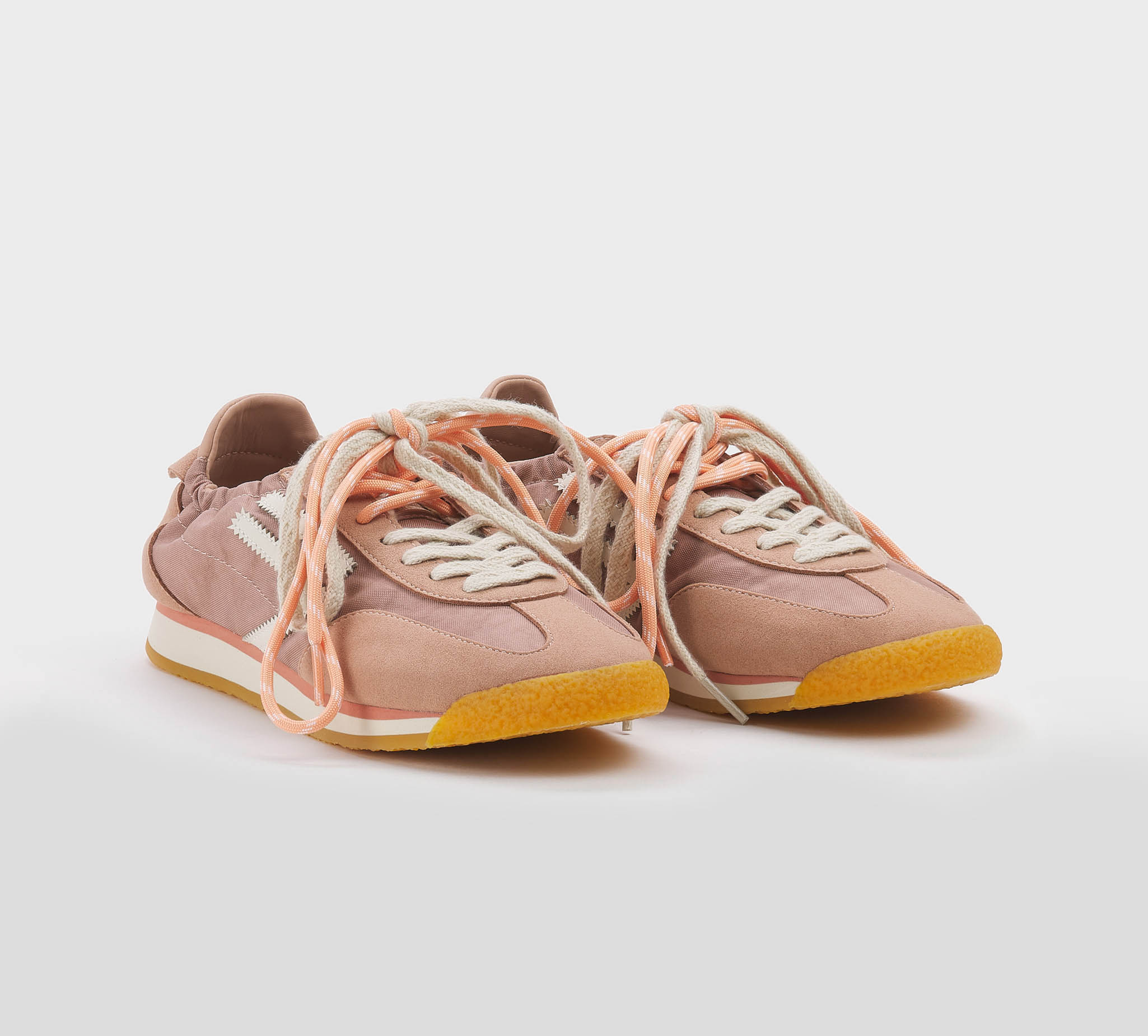 Sneakers arricciata camoscio pesca -inserti tessuto pesca -logo pelle bianco -talloncino pesca -doppio laccio panna -salmone -plantare anatomico -calzata regolare Fondo gomma SS 26