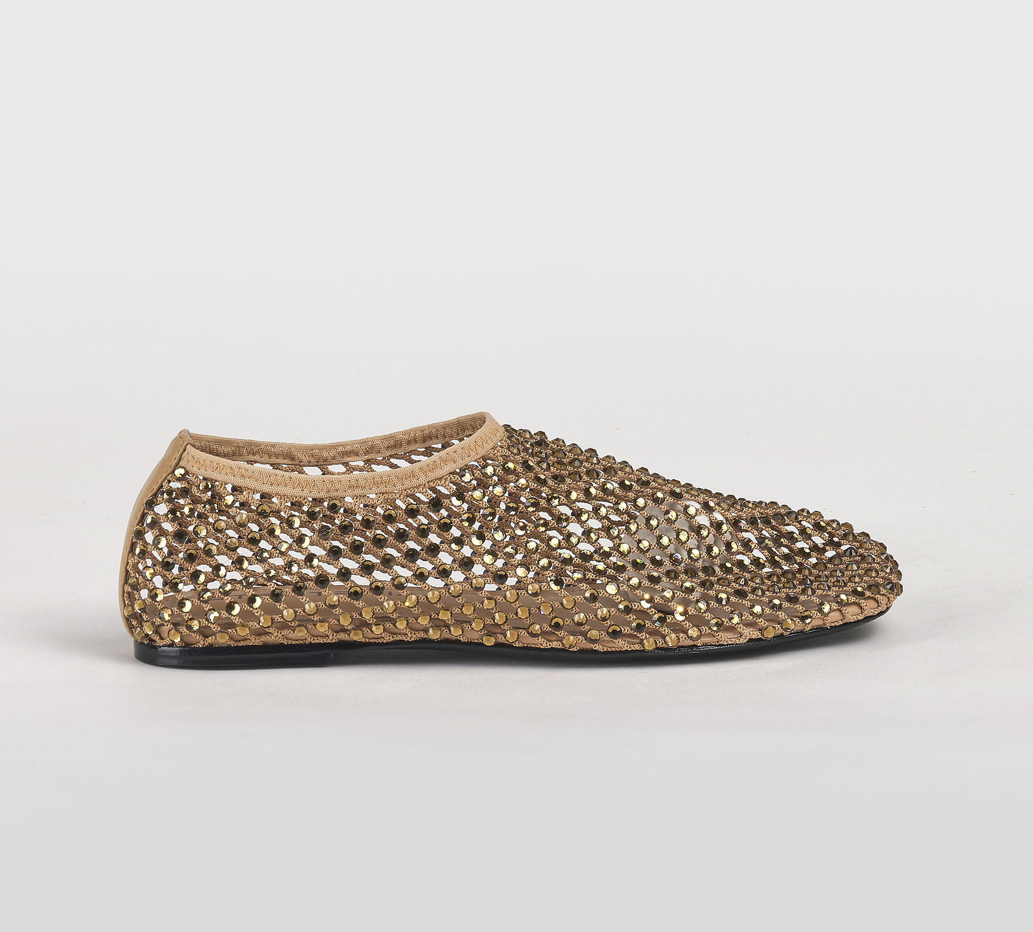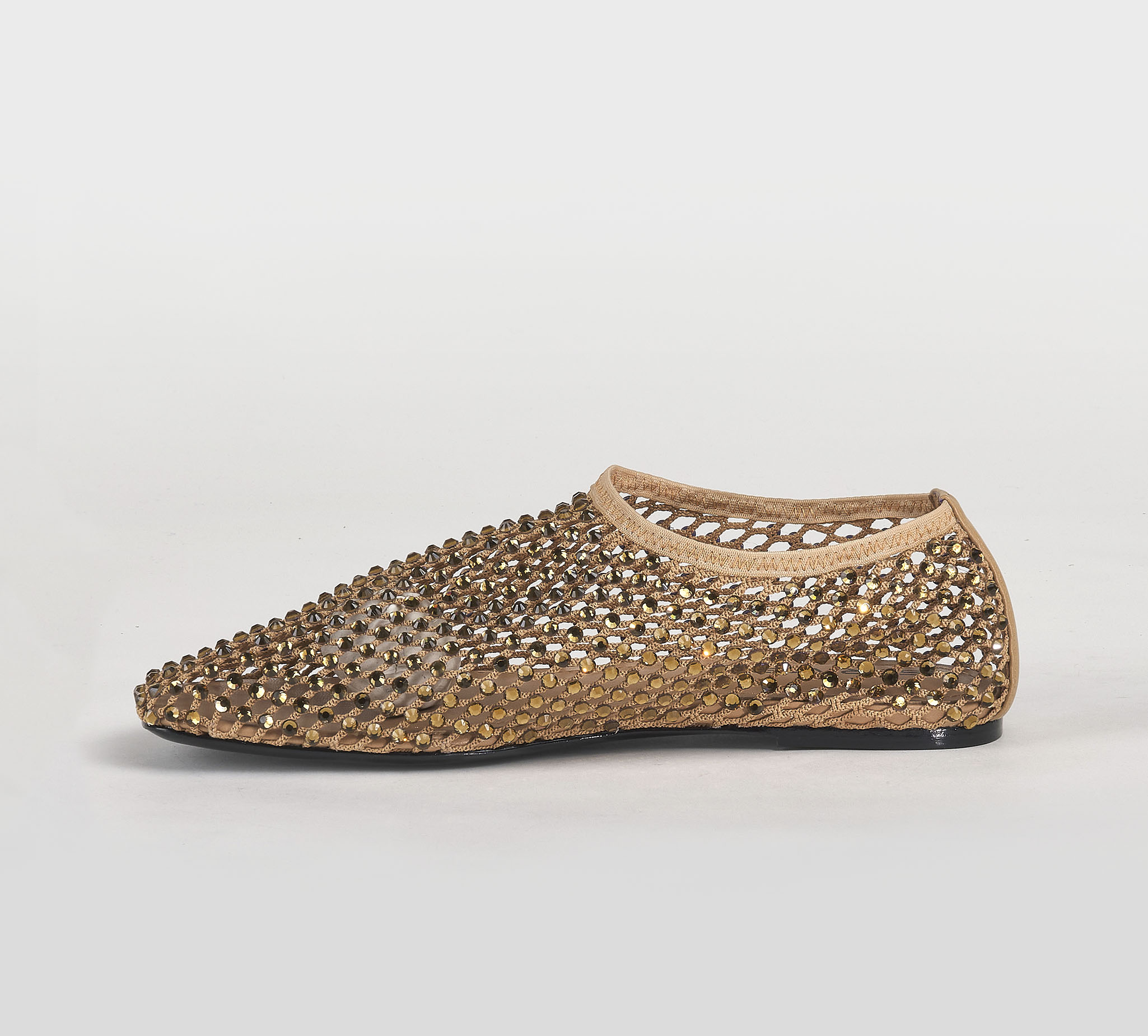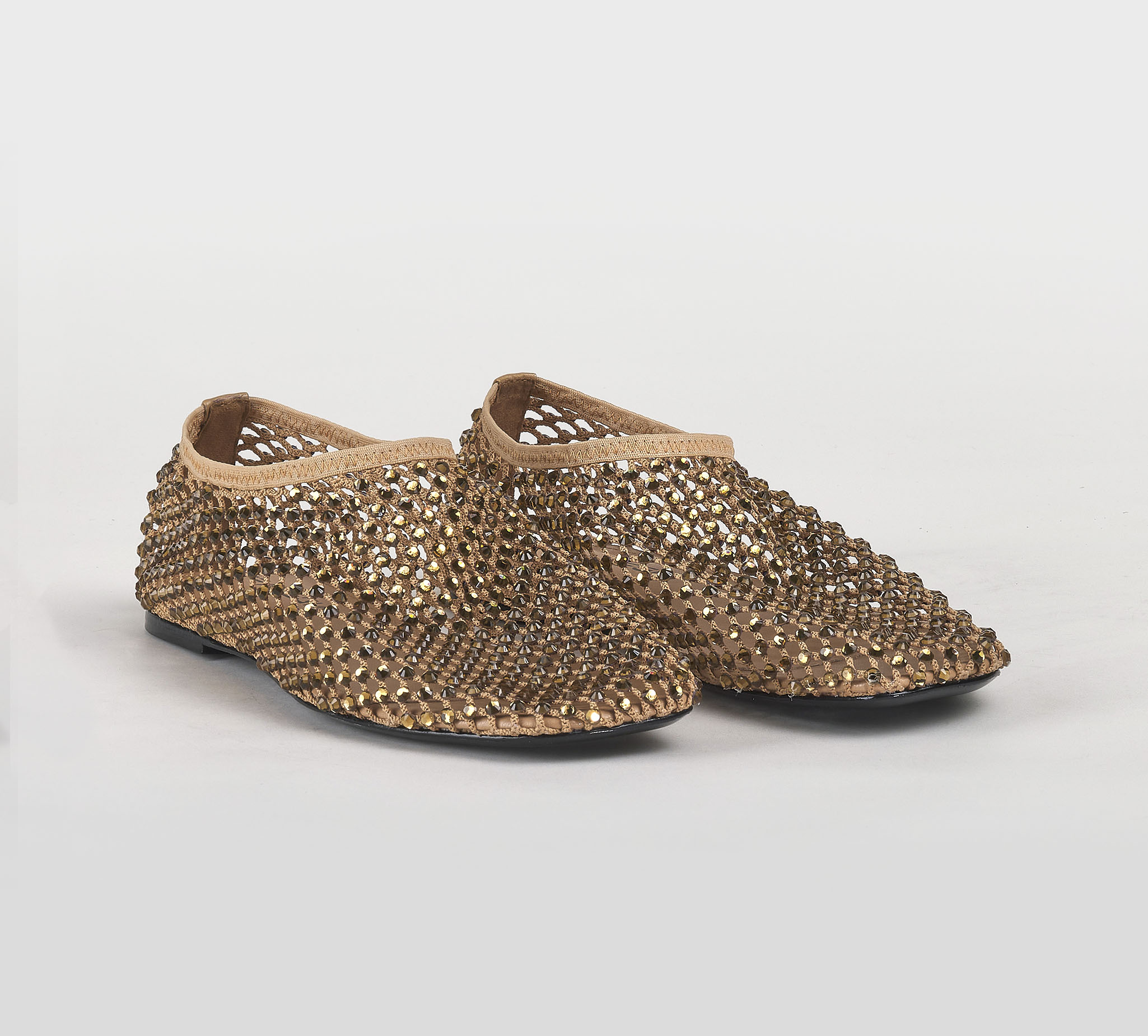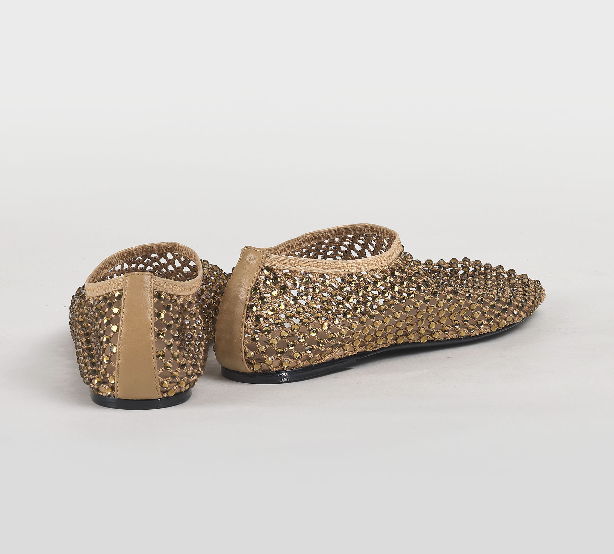 Ballerina in rete sahara -swarovsky bronzo -tacco cm 1 -calzata regolare Fondo cuoio Mde in Italy SS 26