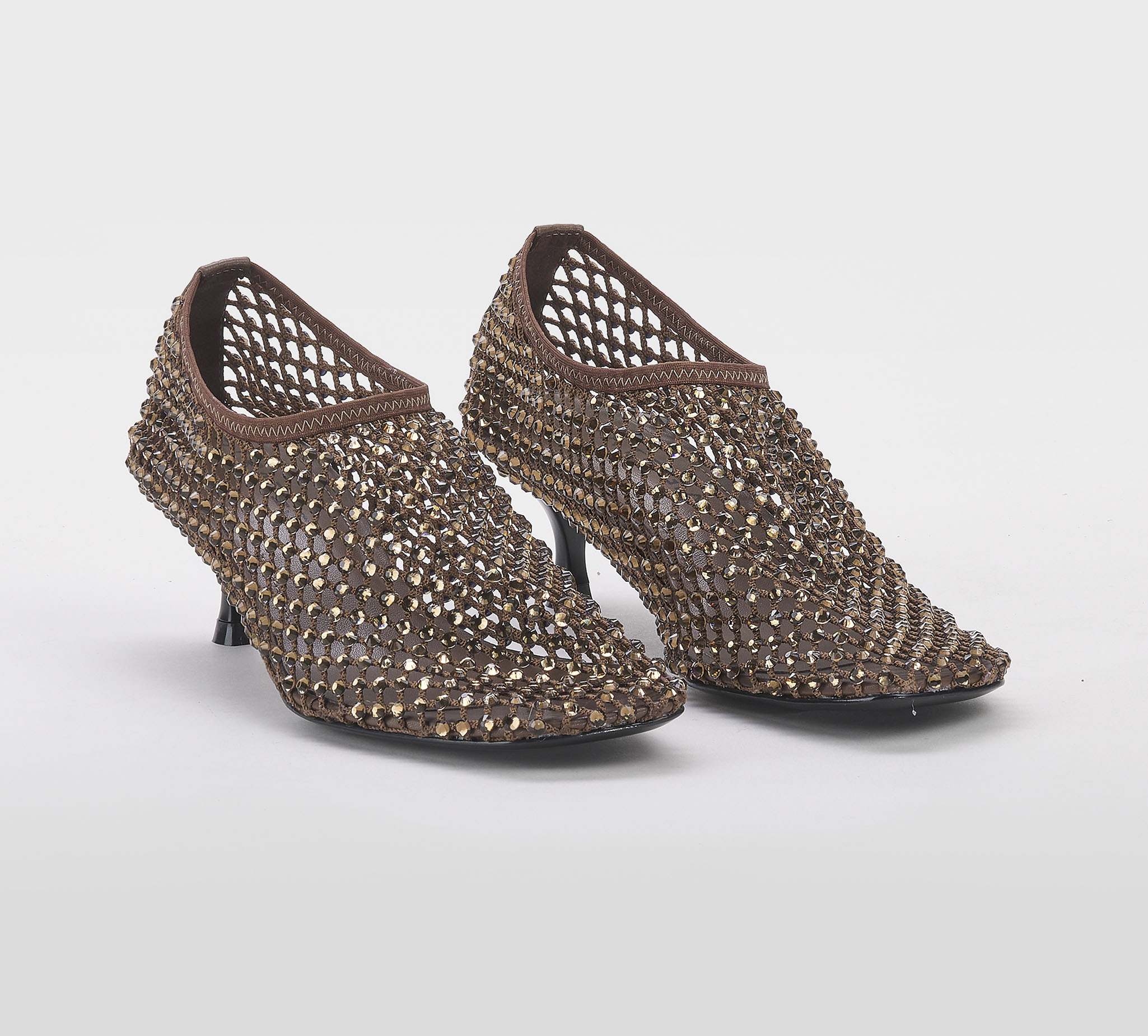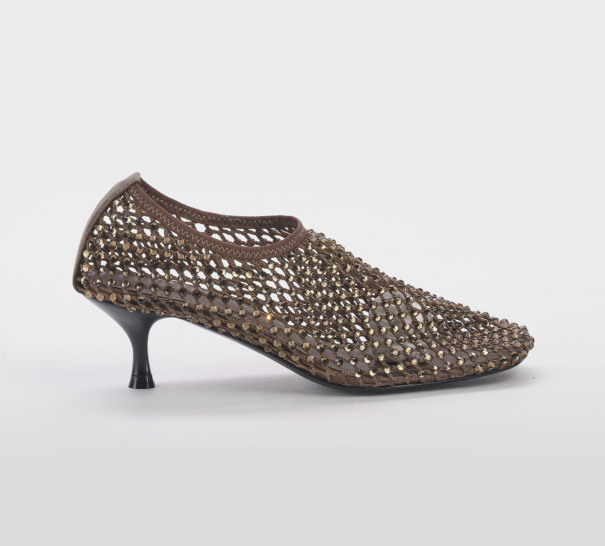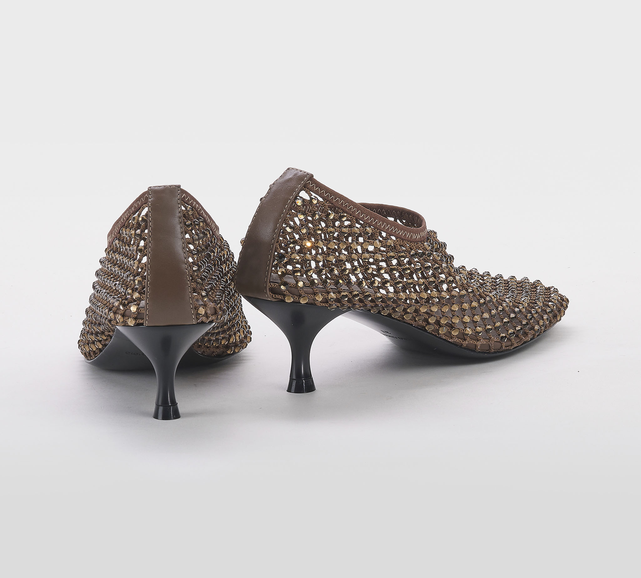 Decoltè accollata rete cacao -swarovsky bronzo -tacco cm 5 -calzata regolare Fondo cuoio Mde in Italy SS 26
