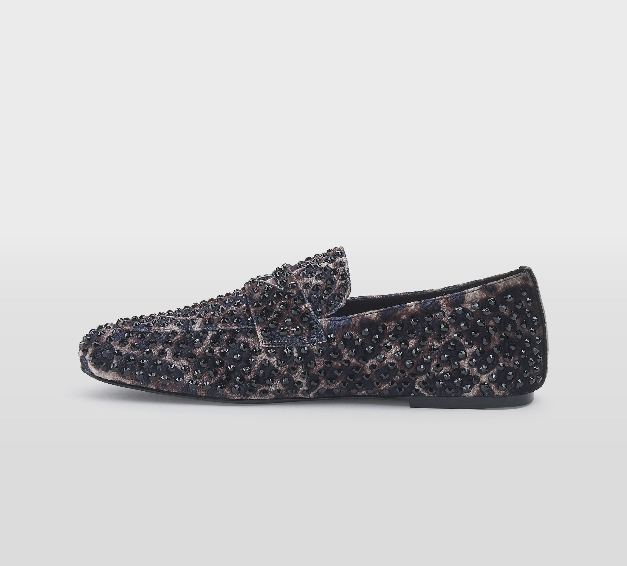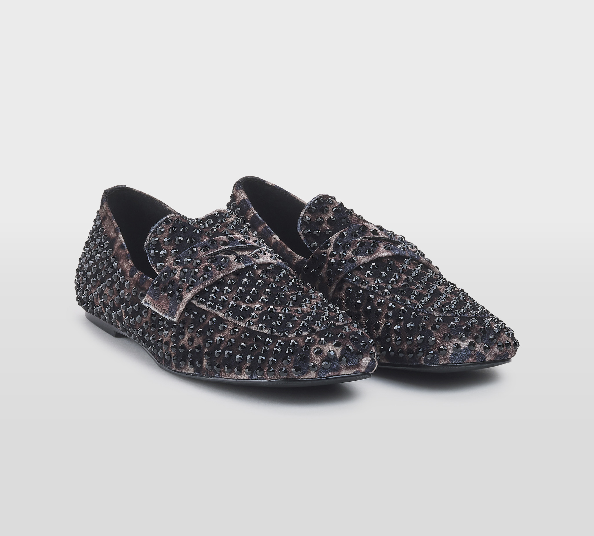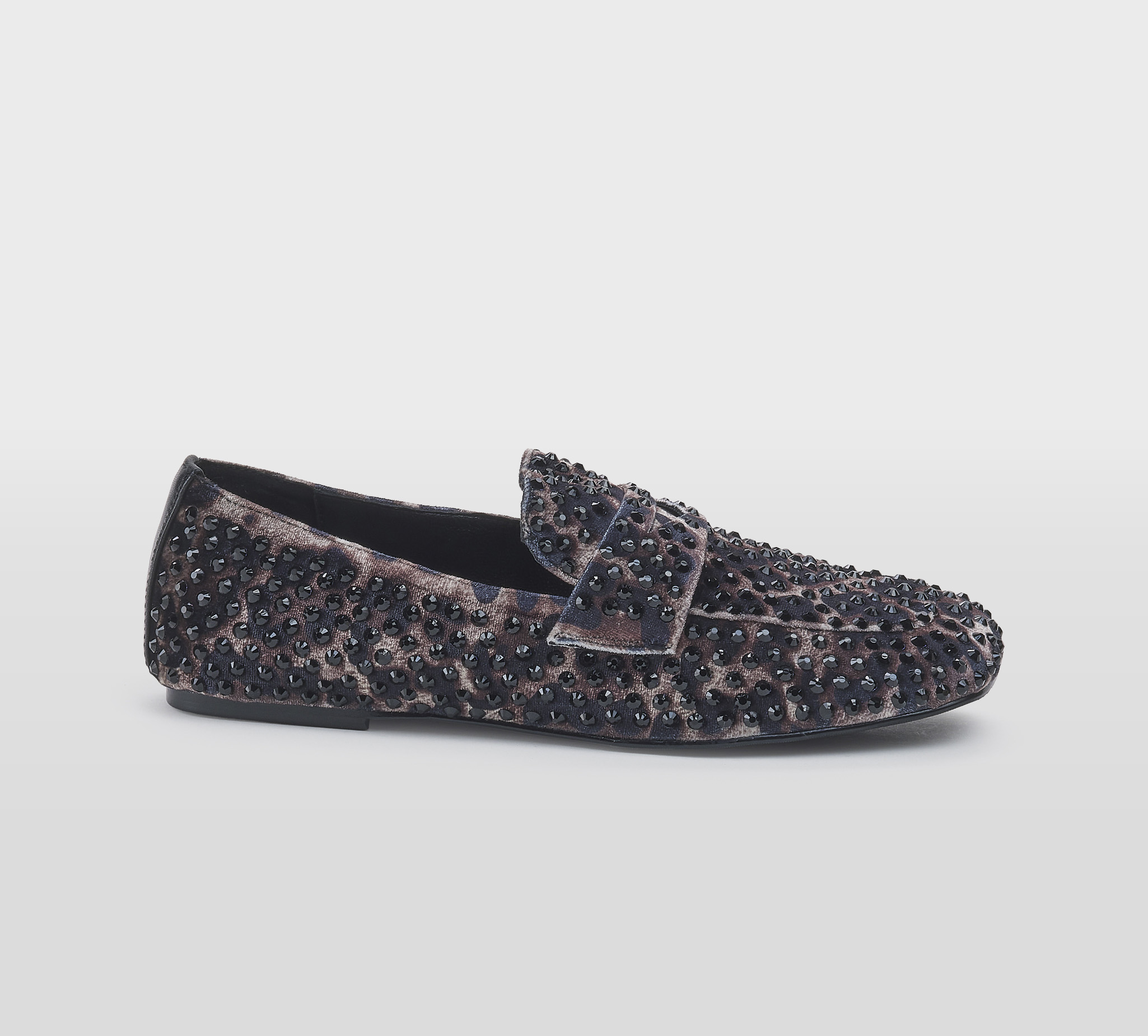 Mocassino in velluto maculato -swarovsky nero -barretta maculata -calzata regolare -tacco cm 1 Fondo gomma FW 25