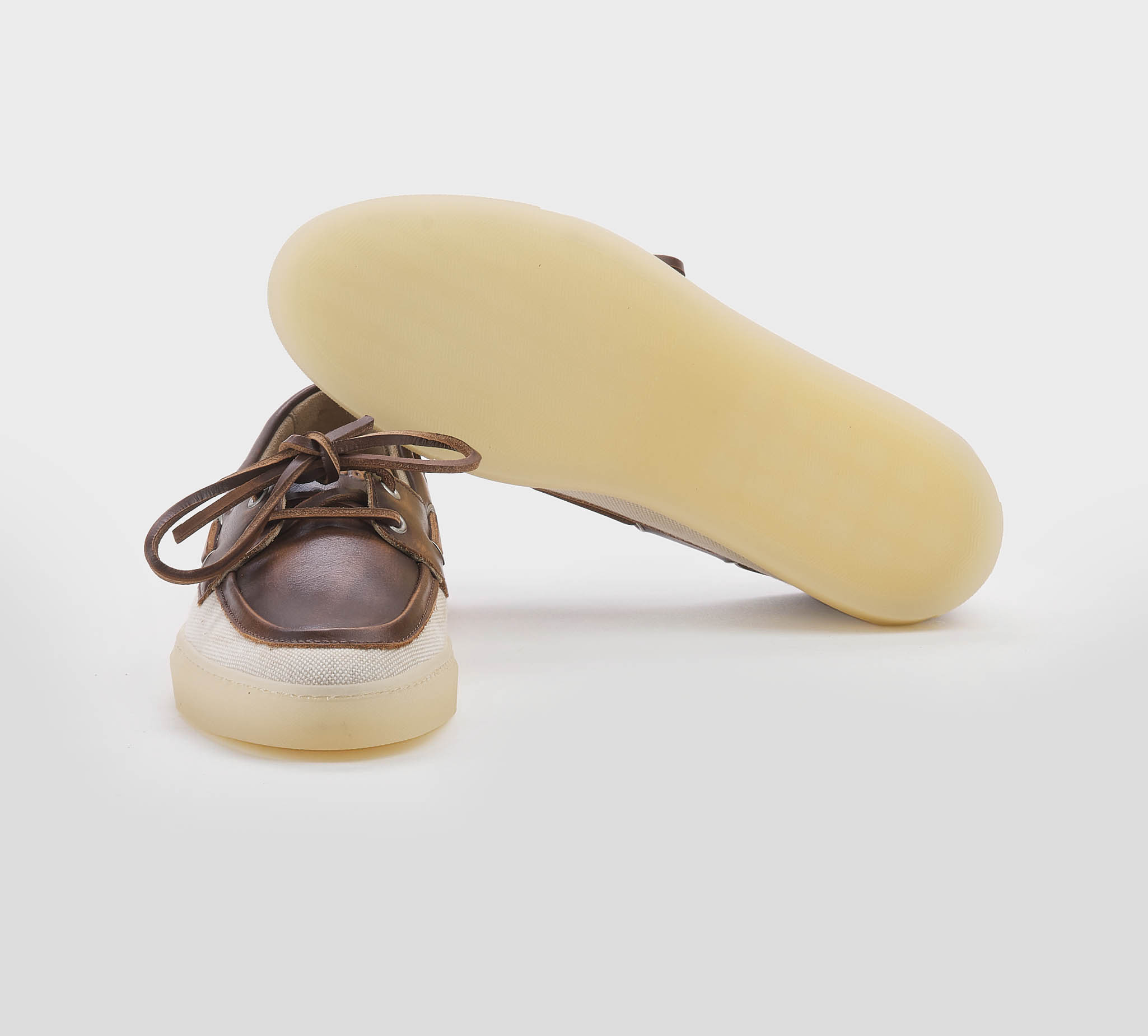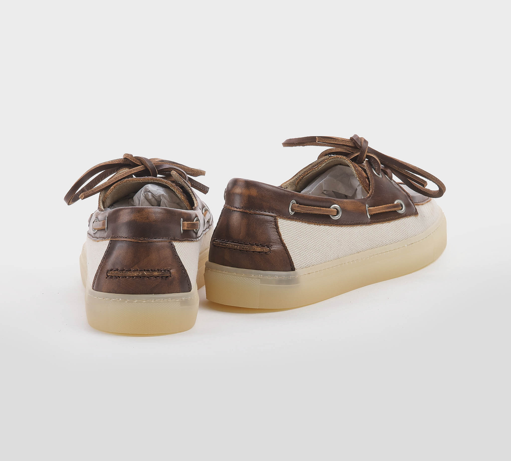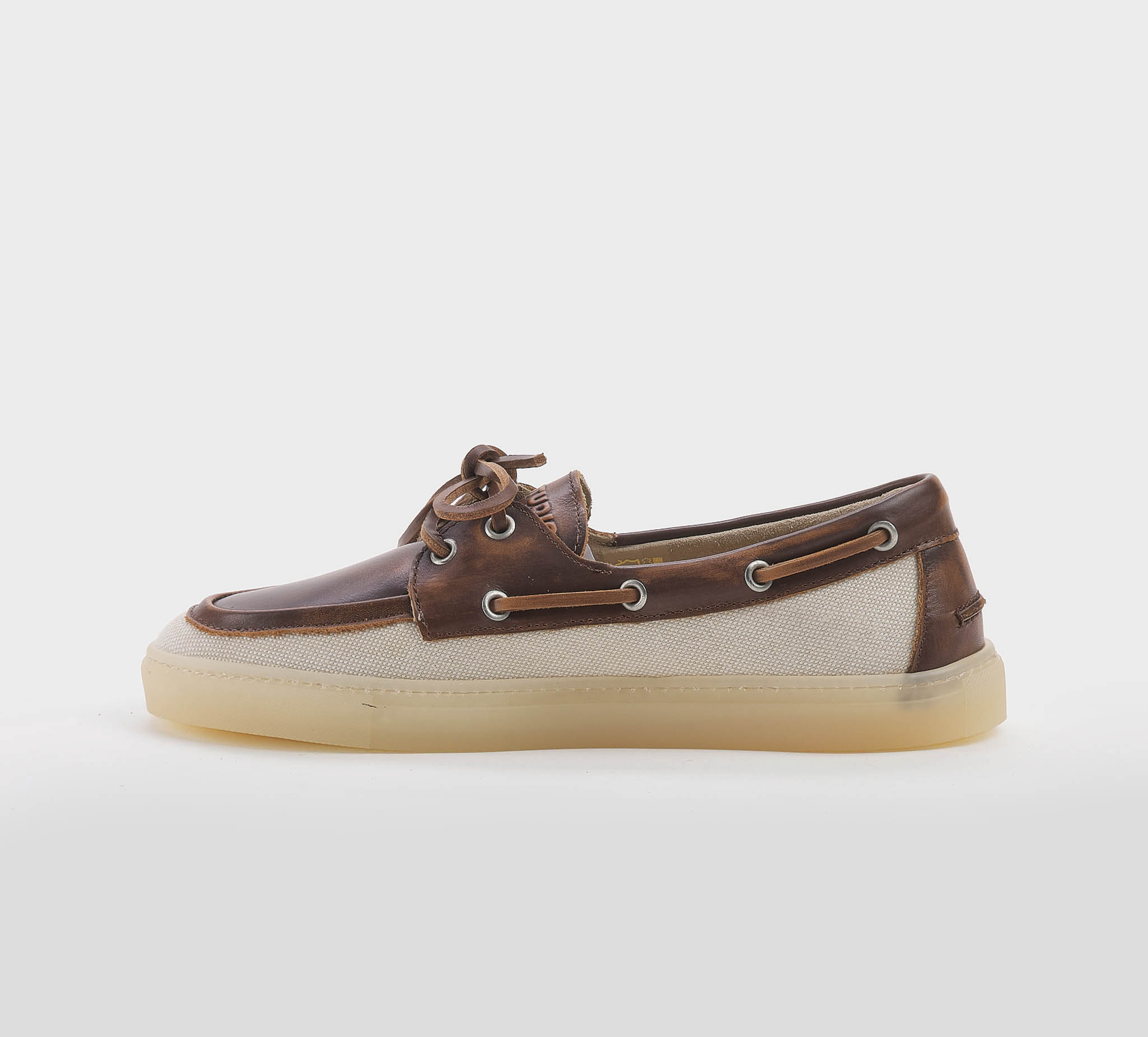 Mocassino barca in pelle marrone -inserti canvas panna -laccio cuoio -calzata regolare Fondo gomma SS 26