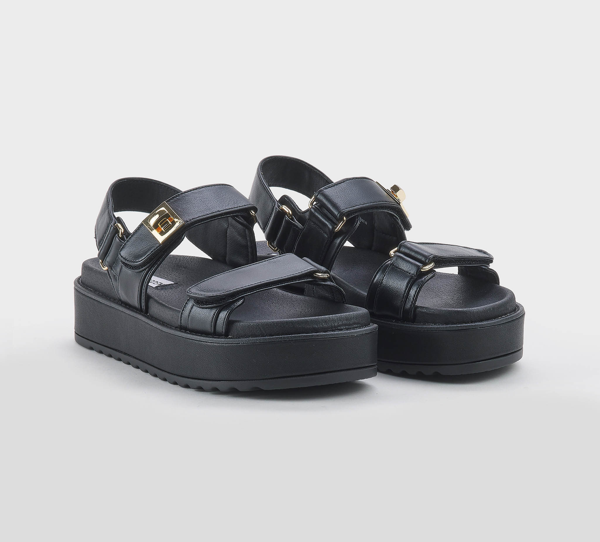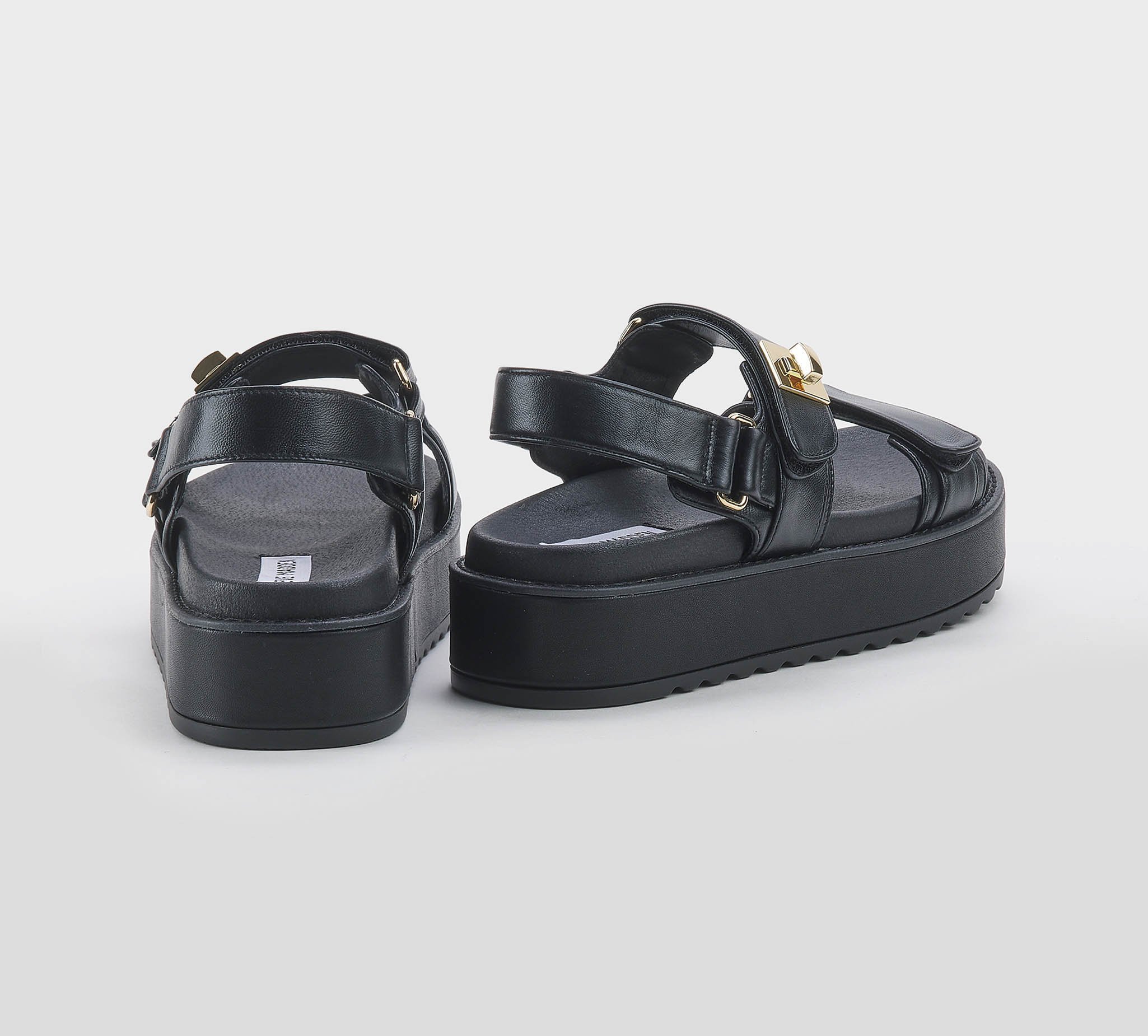 Sandalo pelle nero -doppio strappo -lucchetto oro -zeppa cm 6 -plantare anatomico -calzata scarsa Fondo gomma Made in China SS 26