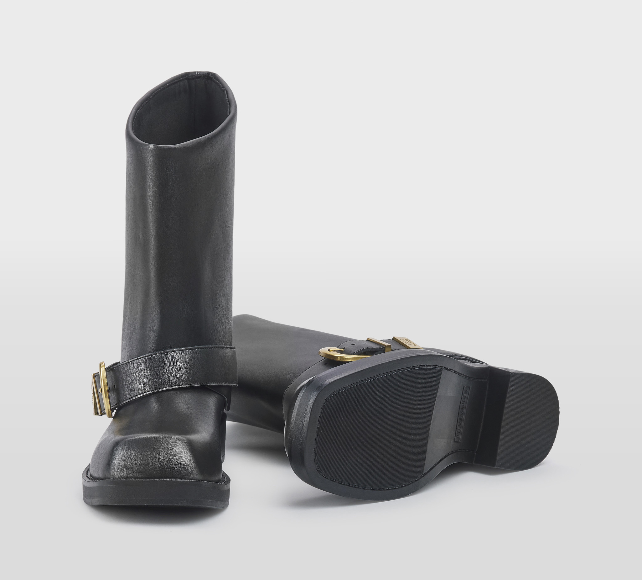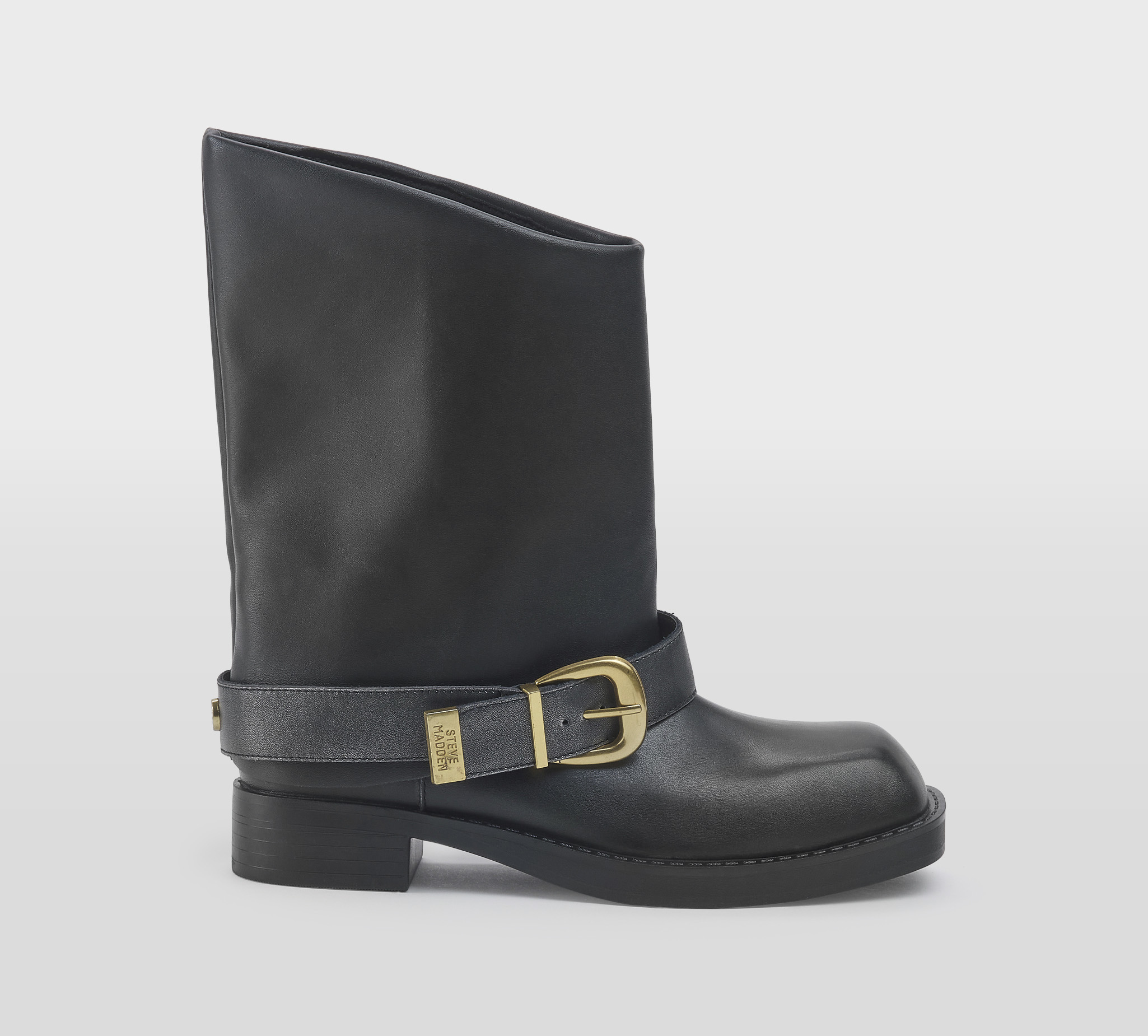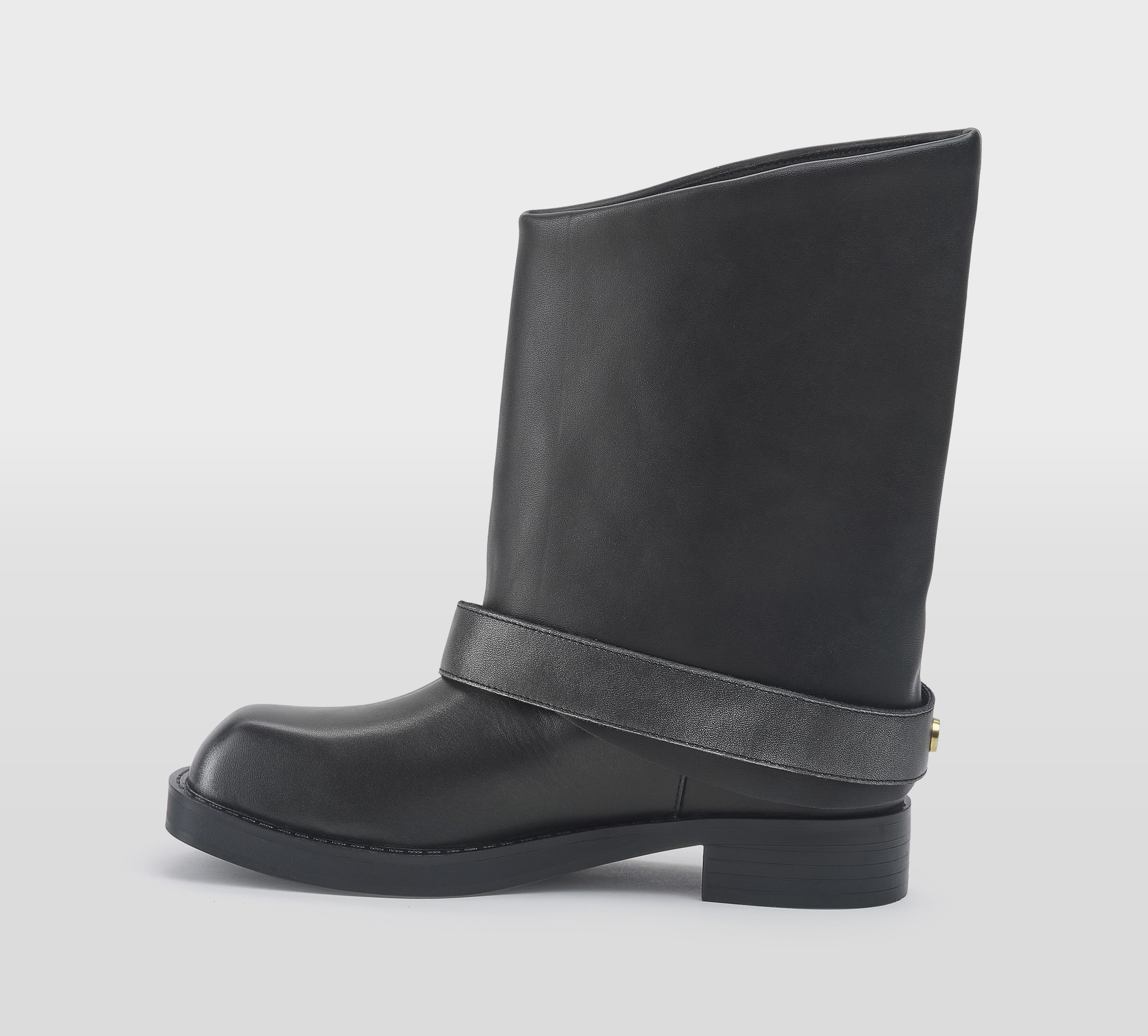 Biker in pelle nero -cinturuino con fibbia oro -gambale a tubo -tacco cm 3 -calzata scarsa Fondo gomma FW 25