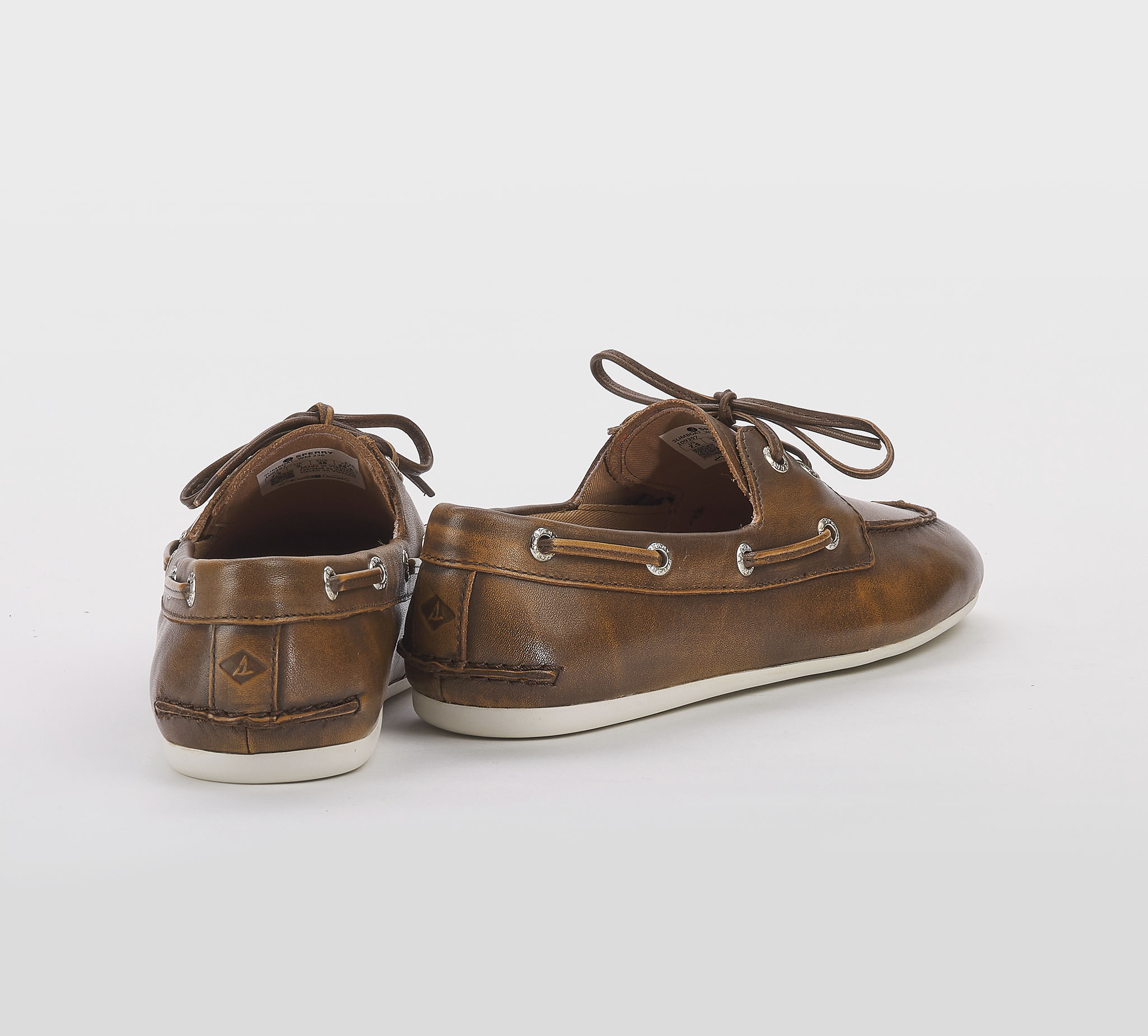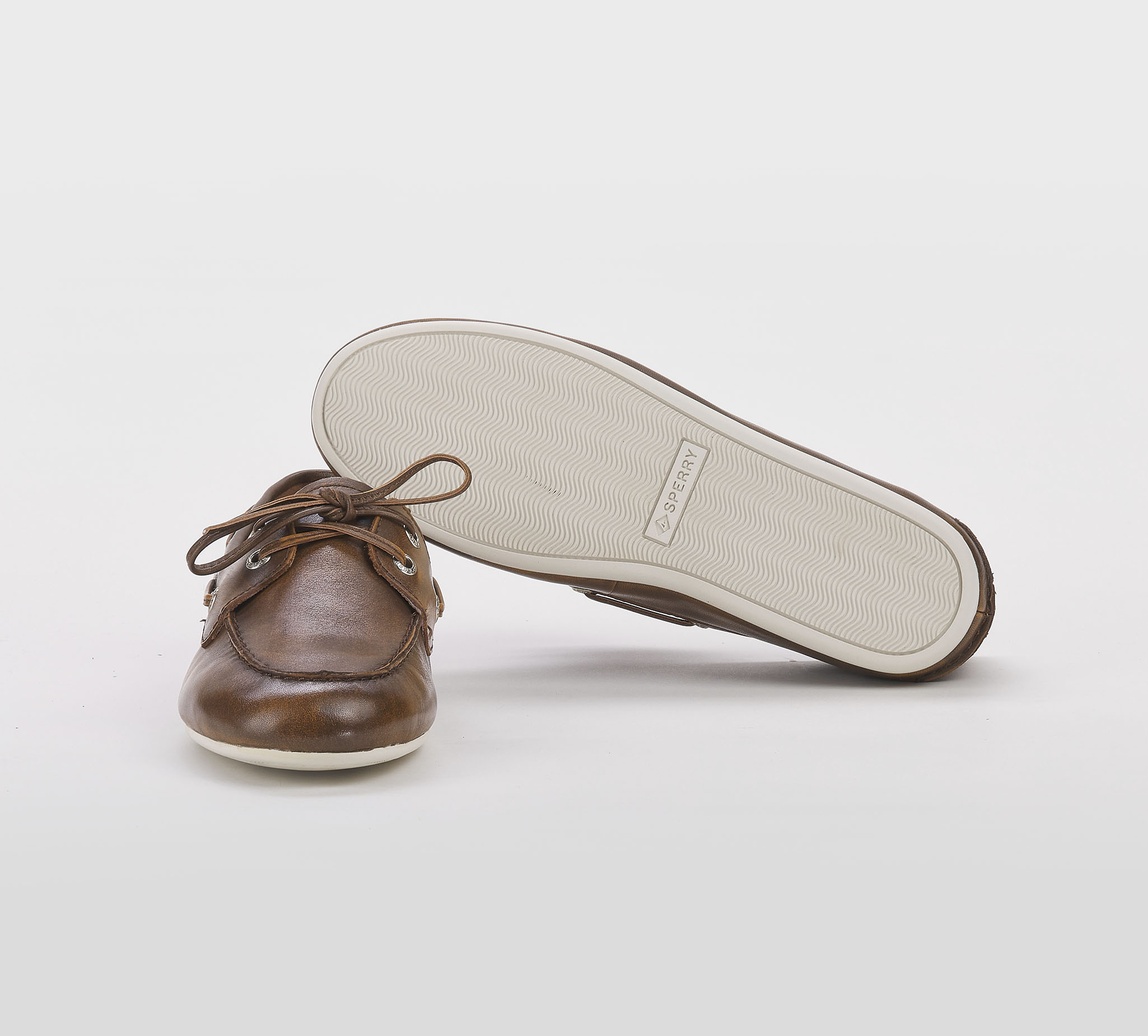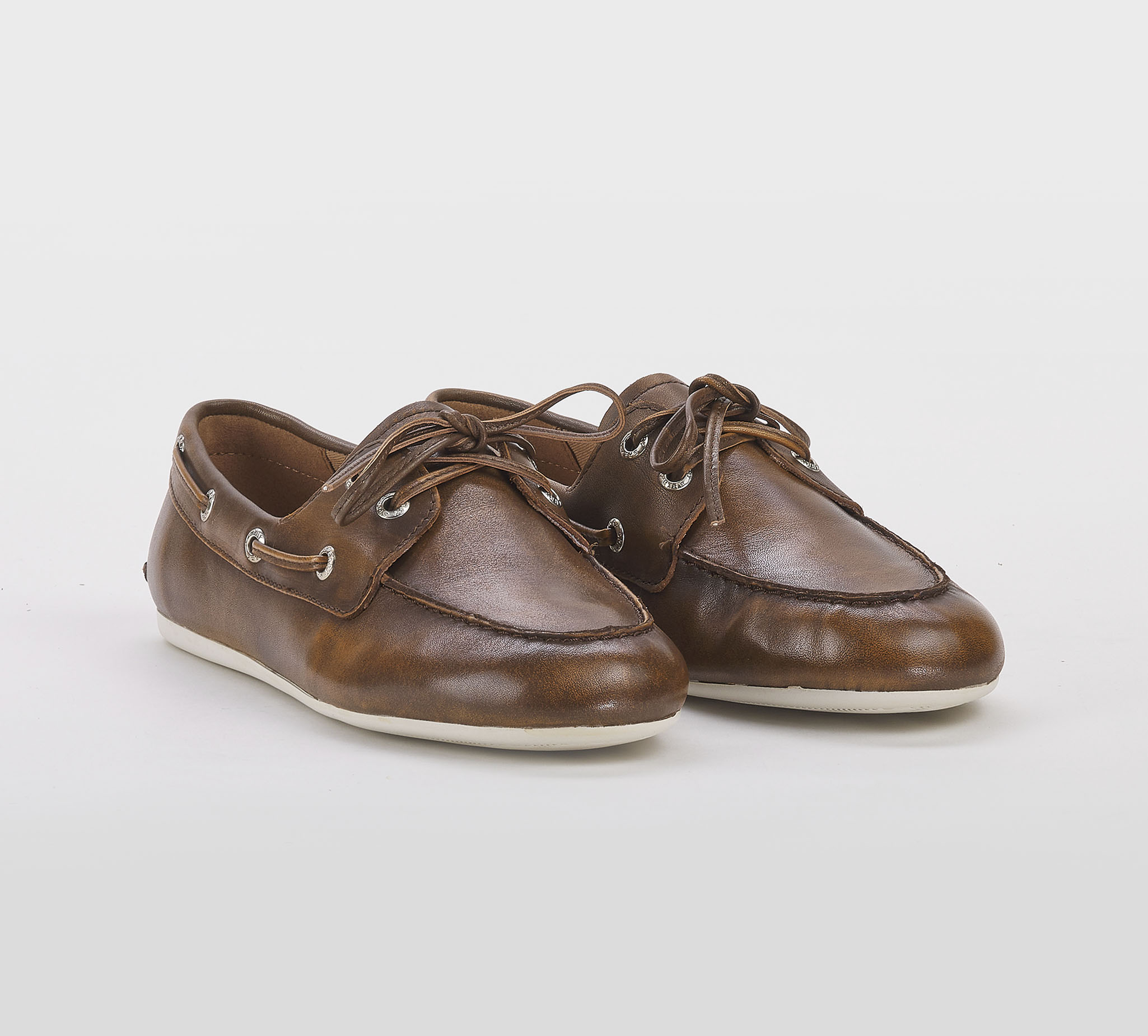 Mocassino barca in pelle sfumata cuoio -cuciture a vista -occhielli argento -laccio cuoio -calzata regoolare Fondo gomma bianco SS 26