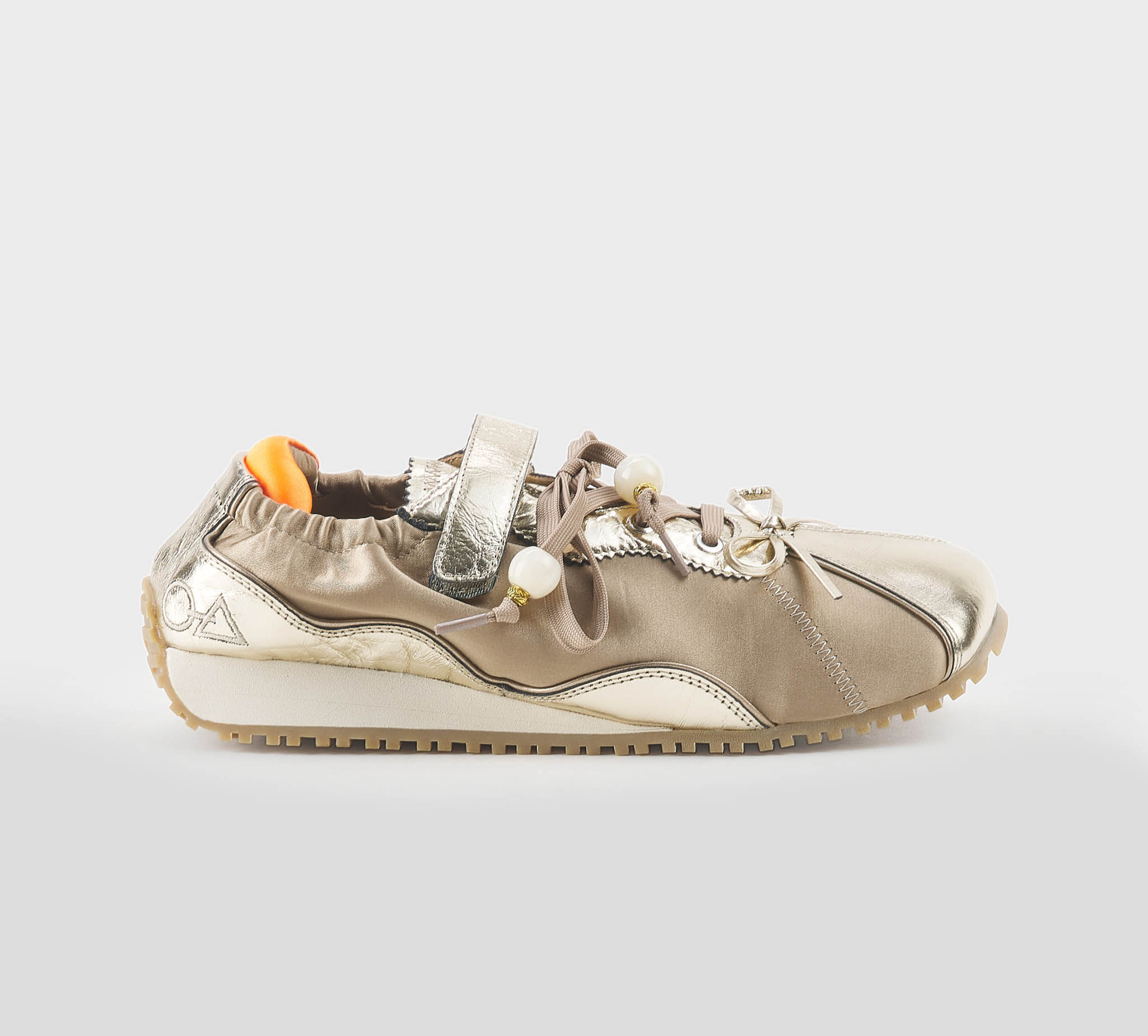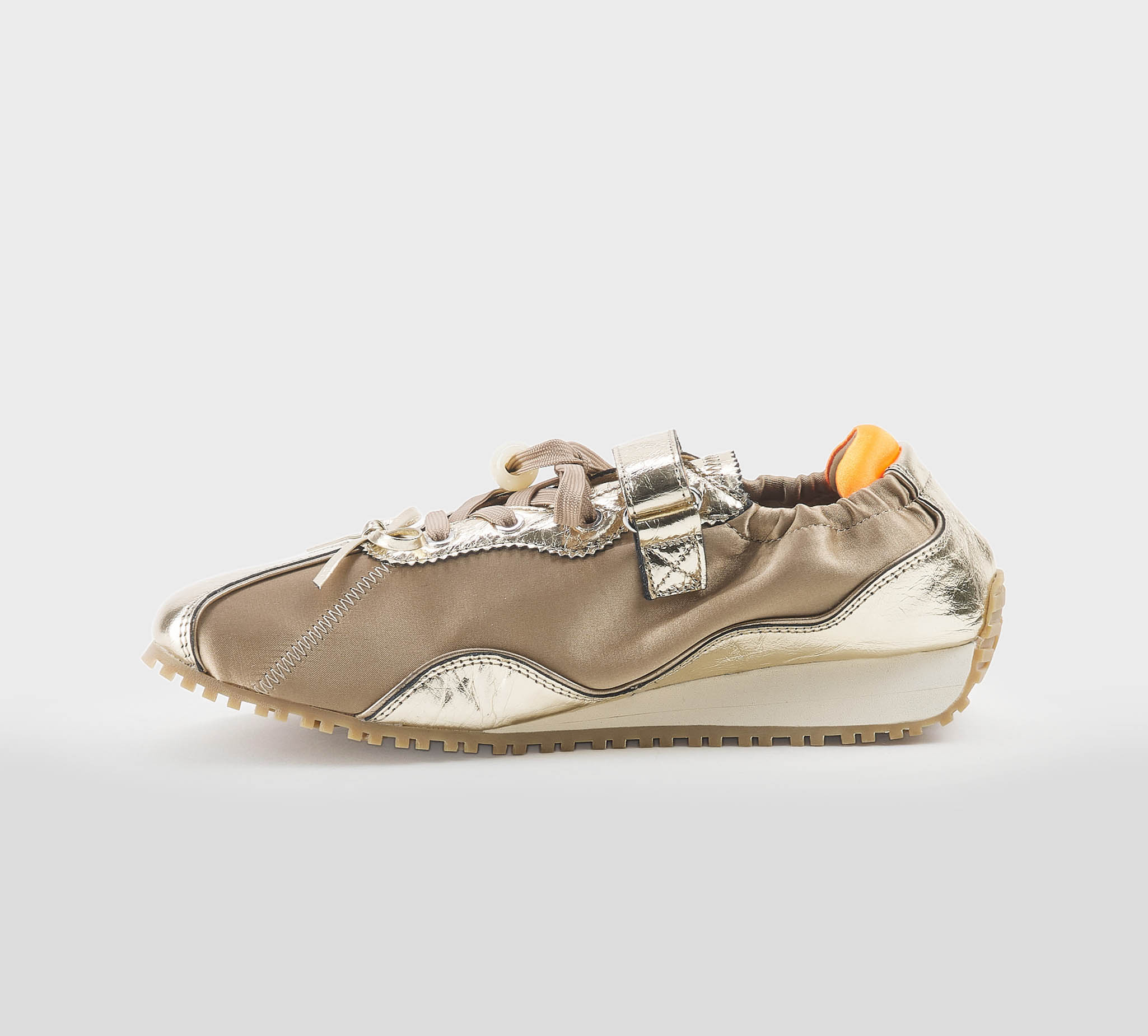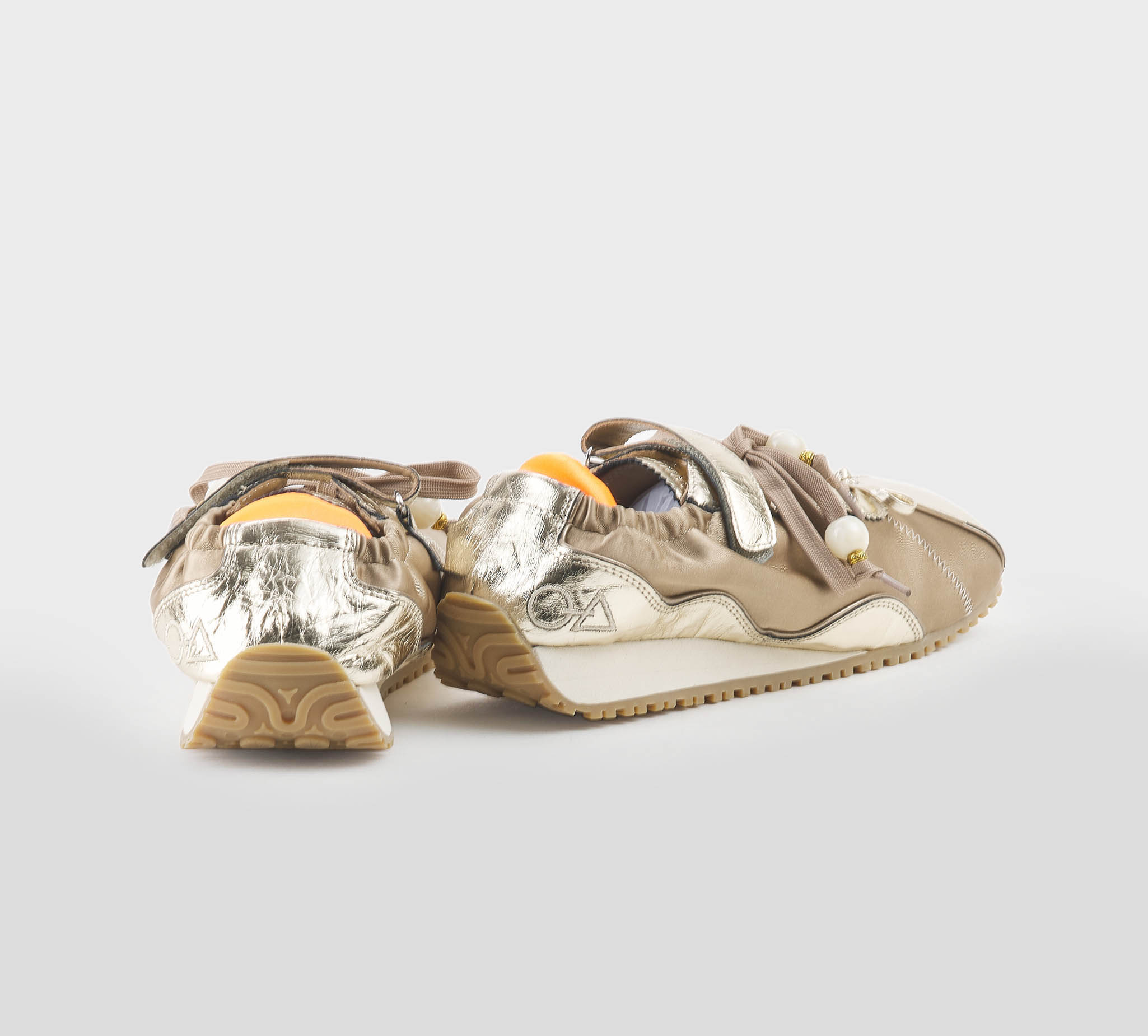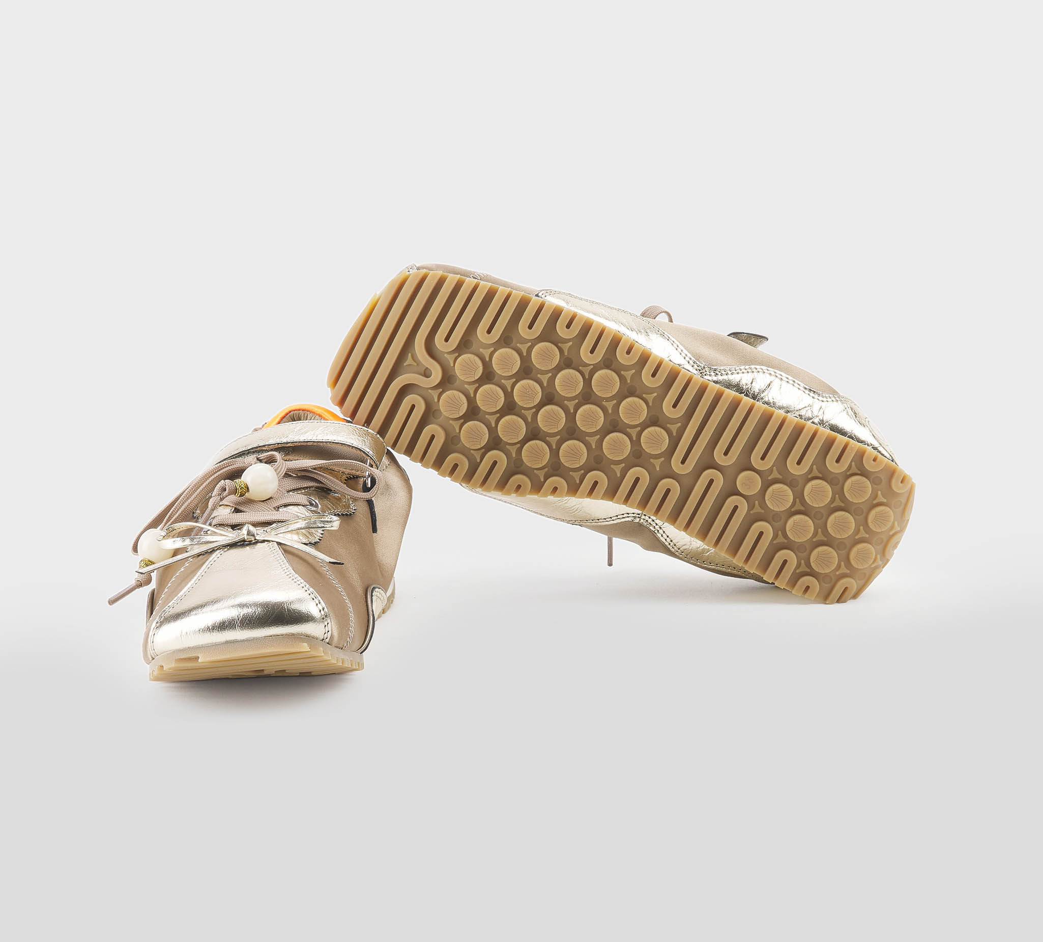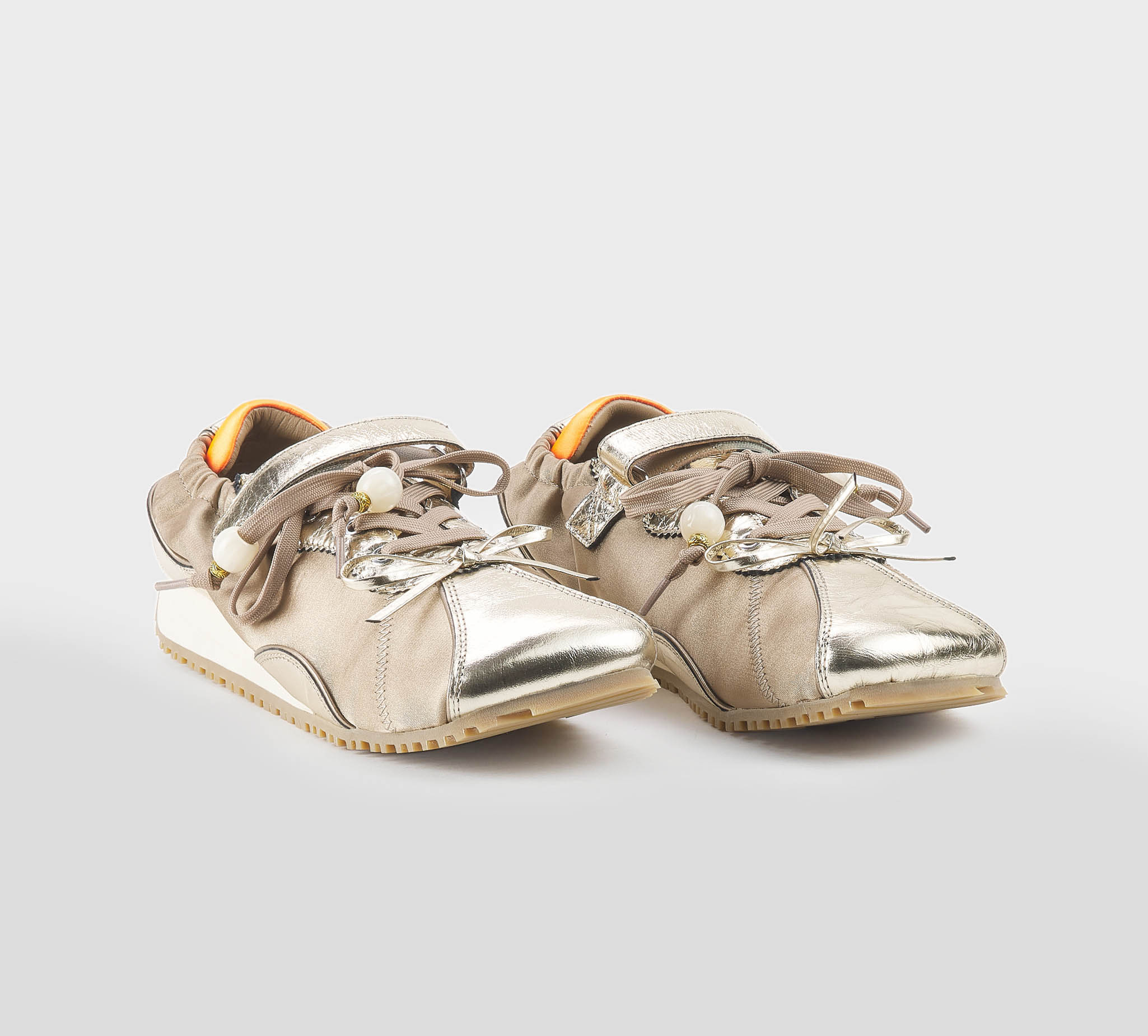 Sneakers arricciata in pelle paltino -inserti tessuto oro -strappo regolabile -laccio con perle -calzata regolare Fondo gomma SS 26